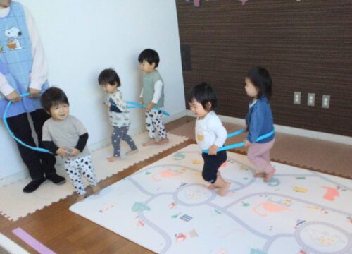 楽器あそびの後は、アンパンマンの積み木あそびとフープを使った電車ごっこを楽しみました。