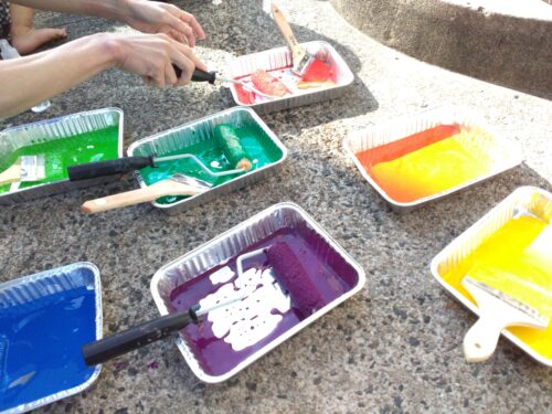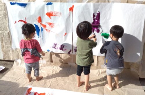 前回まだまだ遊び足りなかったようなので、今回 ハケやローラーを使って大きな紙に絵の具でたくさん色をつけました。