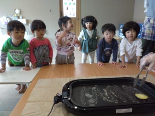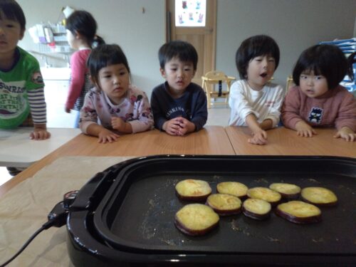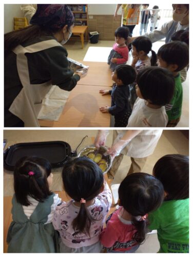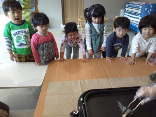 次に大きなホットプレートを目の前に、あめ組(2歳児)は何が始まるのかとワクワク♬