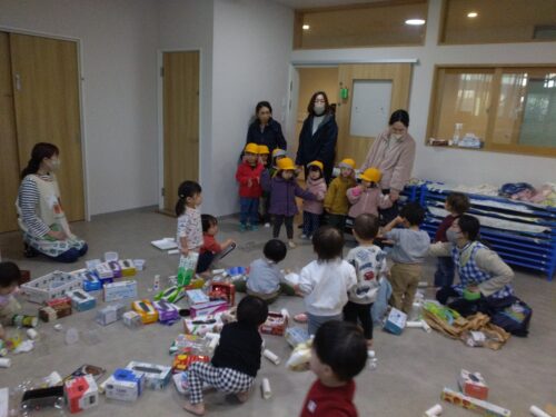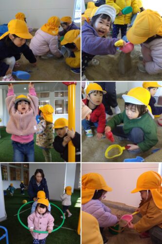 太宰府くじら保育園のあめ組の友だちと一緒に室内園庭で遊びました。