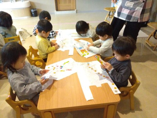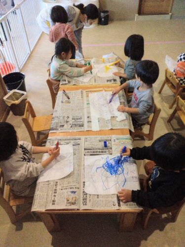 先日、あめ組(2歳児)と だいち組(1歳児)で『たこあげ』の制作をしました。