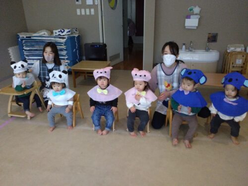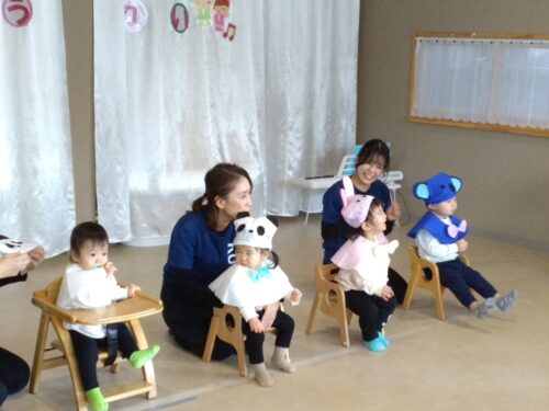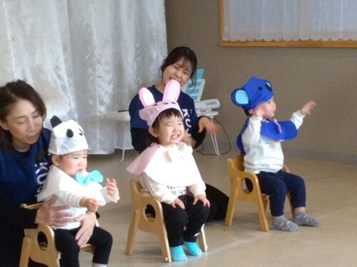 次はうみ組(0歳児)の手遊び歌「パンダうさぎコアラ」「いとまき」です。