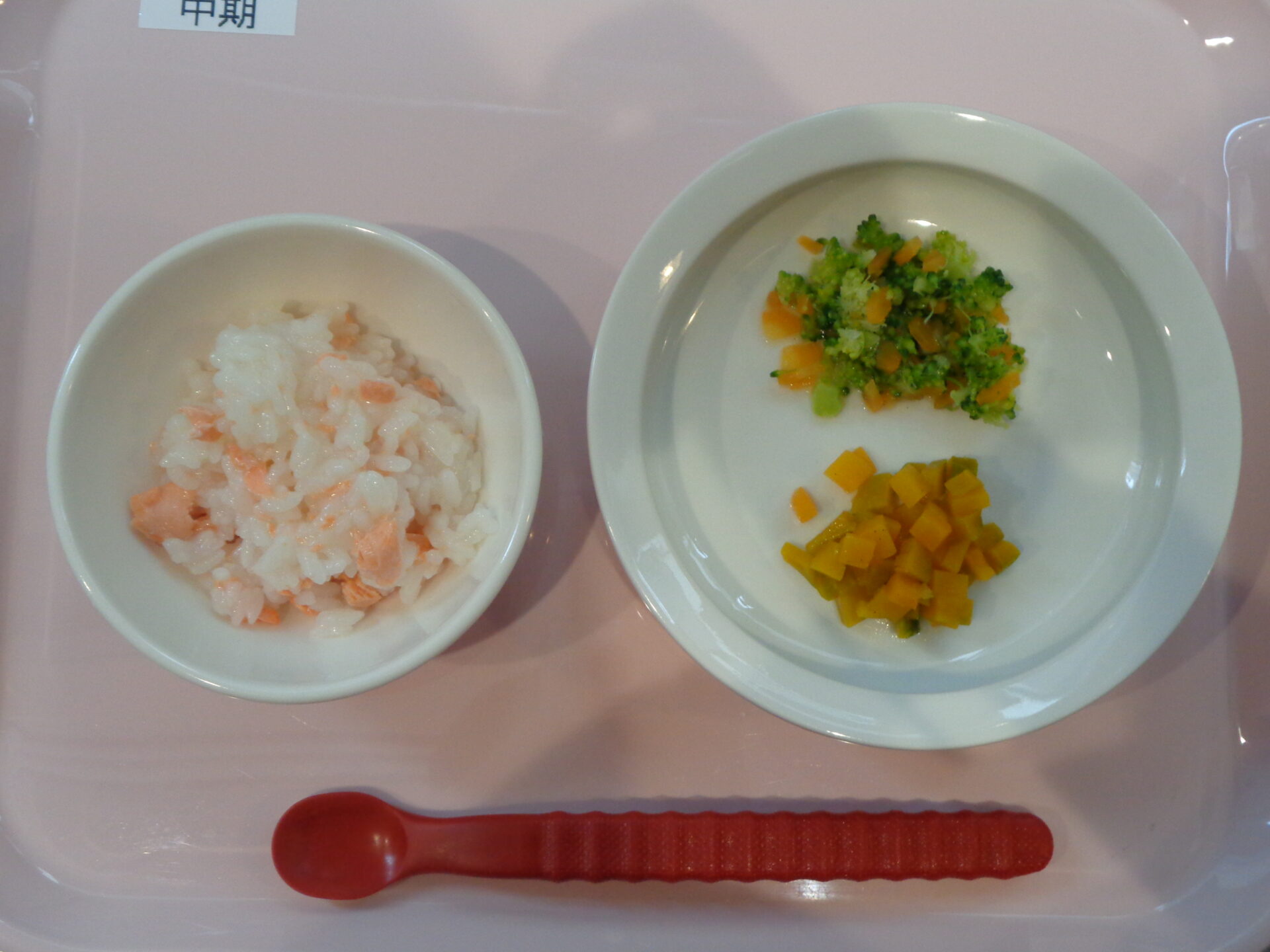 2024.04.08 給食写真 2024年4月8日 給食 【普通食】 鮭チャ-ハン・かぼちゃの煮物・野菜たっぷり豆腐のスープ 【離乳食・中期】 鮭がゆ・ブロッコリーと人参の煮物・かぼちゃの煮物 一覧へ戻る