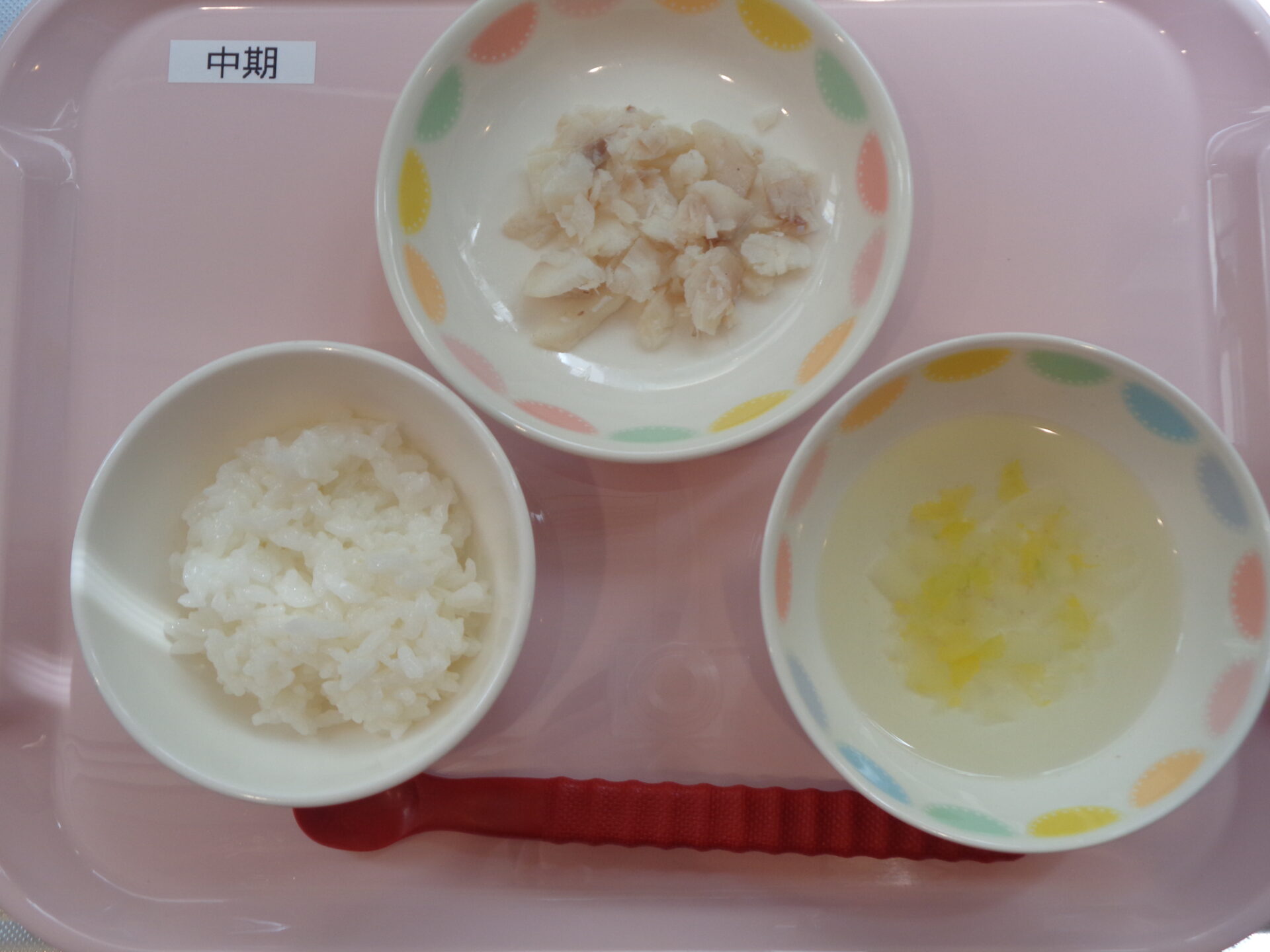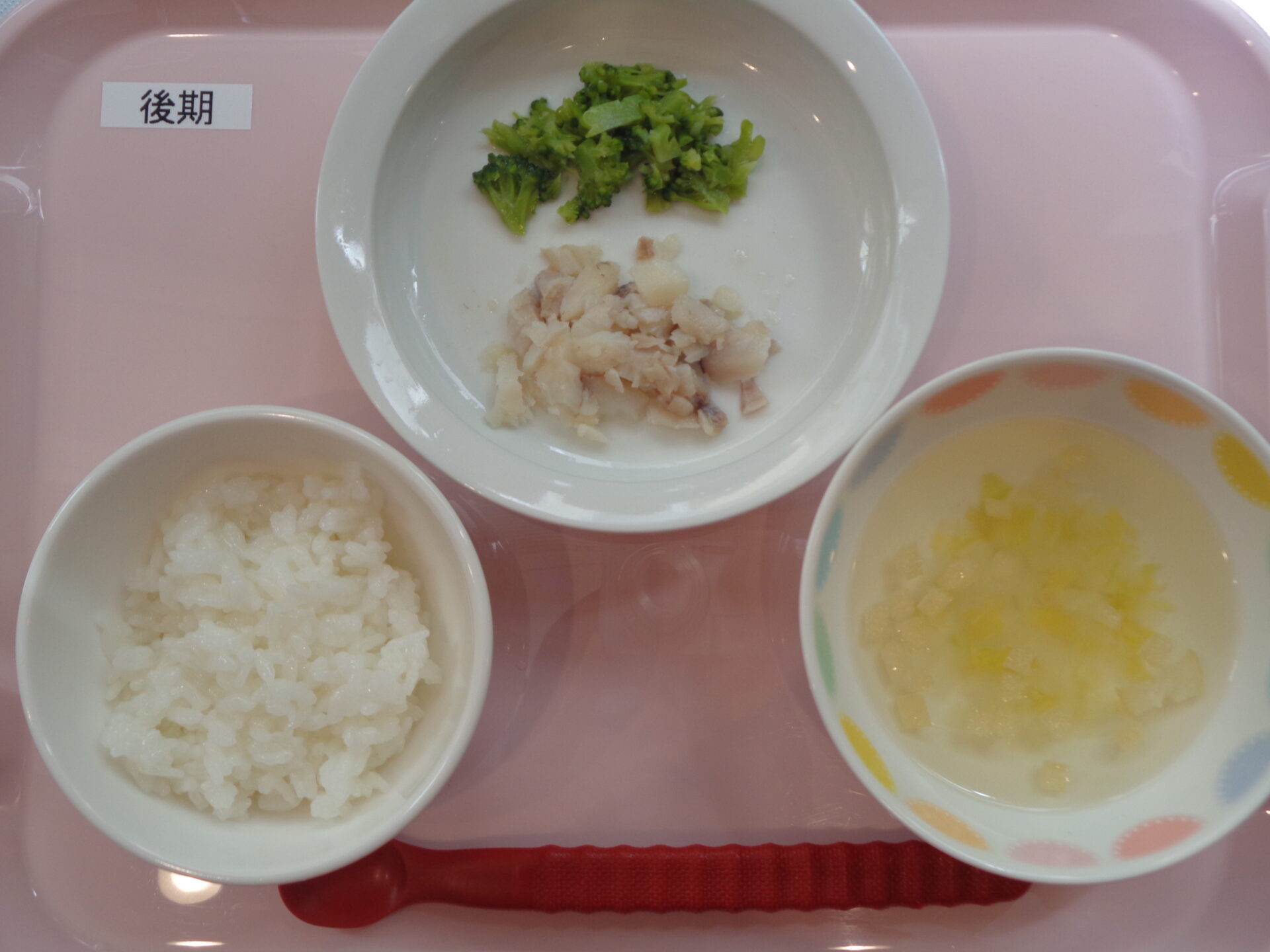 2024.04.16 給食写真 2024年4月16日 給食 【普通食】 ごはん・魚のから揚げ・ブロッコリー・きゅうりの中華サラダ・すまし汁 【離乳食・後期】 ごはん・魚の煮物・ブロッコリー・白菜のすまし汁 【離乳食・中期】 お粥・魚の煮物・白菜のスープ 一覧へ戻る