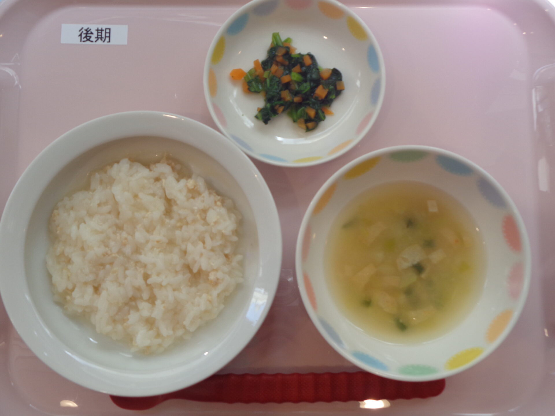 鶏がゆ・ほうれん草のおひたし・キャベツの味噌汁