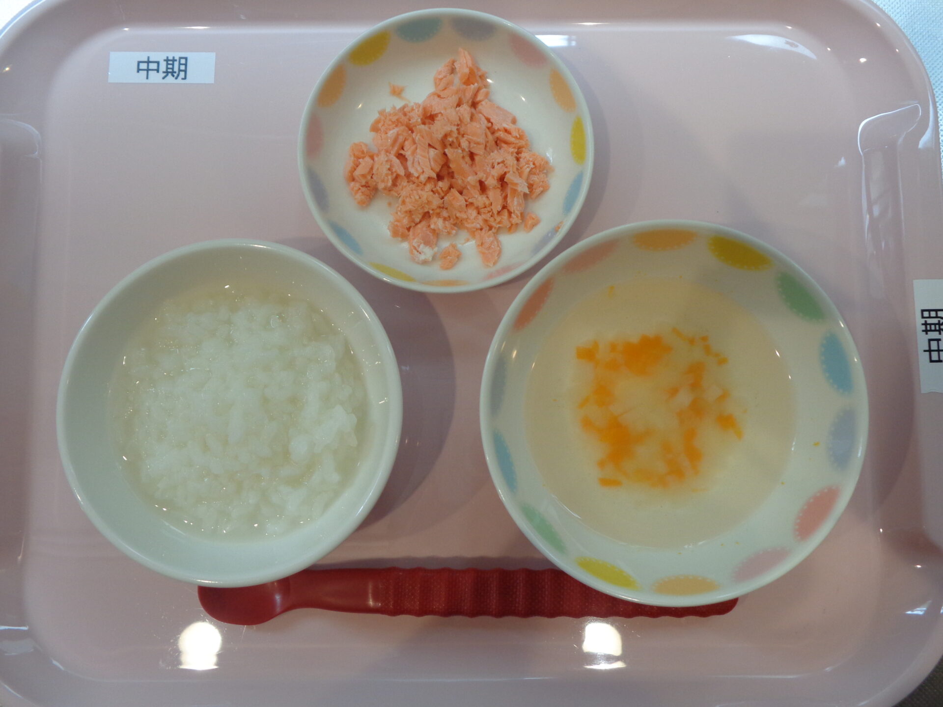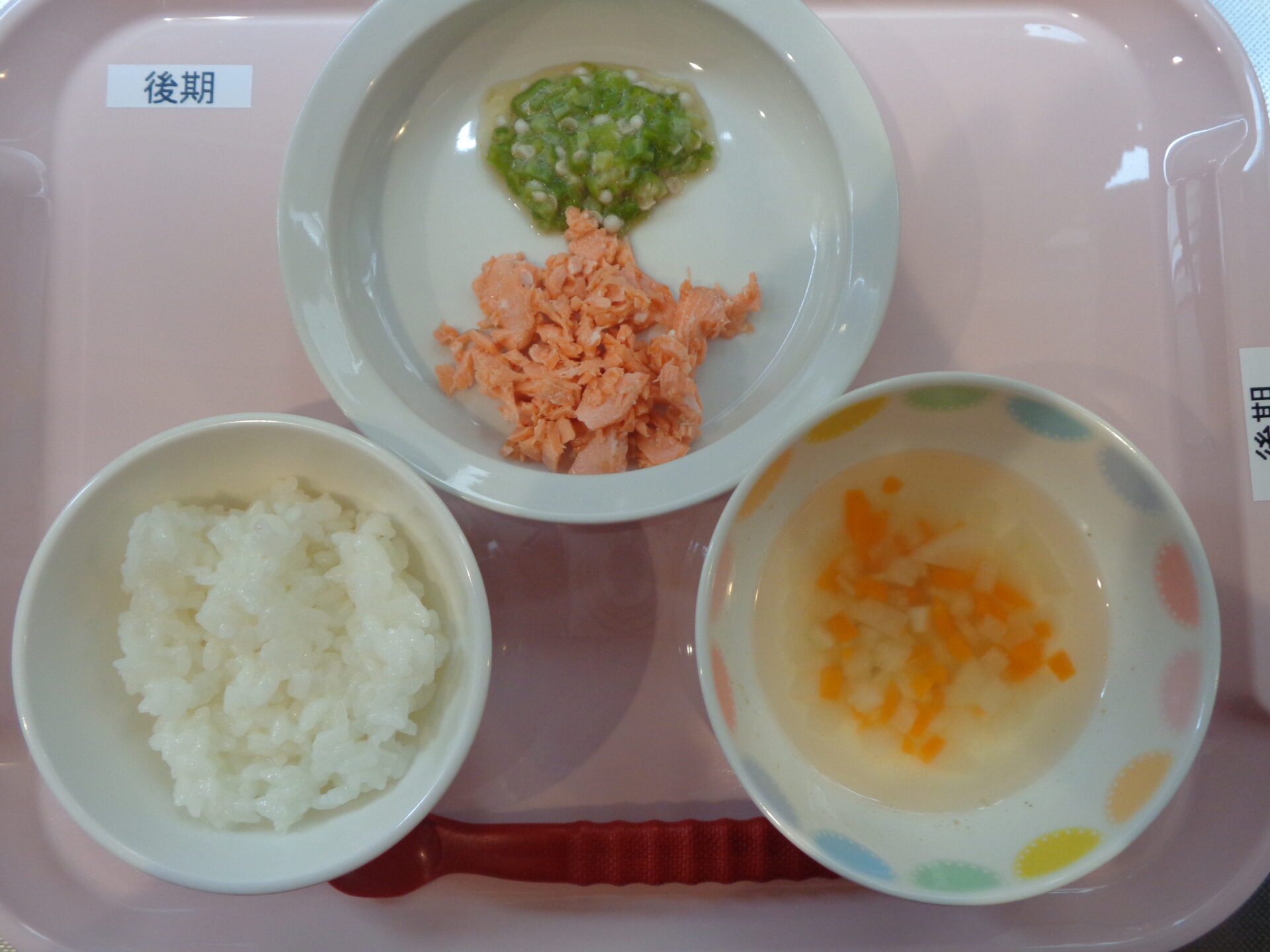 2024.04.26 給食写真 2024年4月26日 給食 【普通食】 麦ごはん・魚の蒲焼・オクラのおかか和え・のっぺい汁 【離乳食・後期】 ごはん・魚の煮物・オクラのおひたし・根菜スープ 【離乳食・中期】 お粥・魚の煮物・根菜スープ 一覧へ戻る