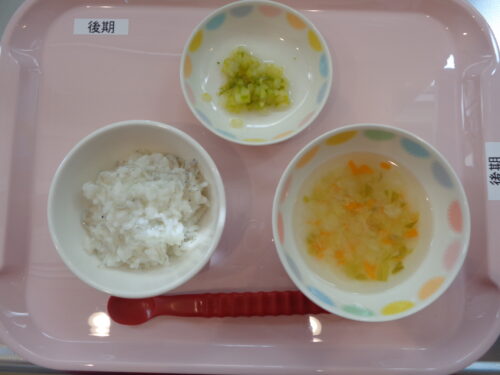 2024.05.02 給食写真 2024年5月2日 給食 【普通食】 ・ごはん ・こいのぼりミートローフ ・アスパラのマリネ ・ポトフ ・ヤクルト 【後期食】 ・しらす雑炊 ・アスパラの煮物 ・野菜スープ 一覧へ戻る