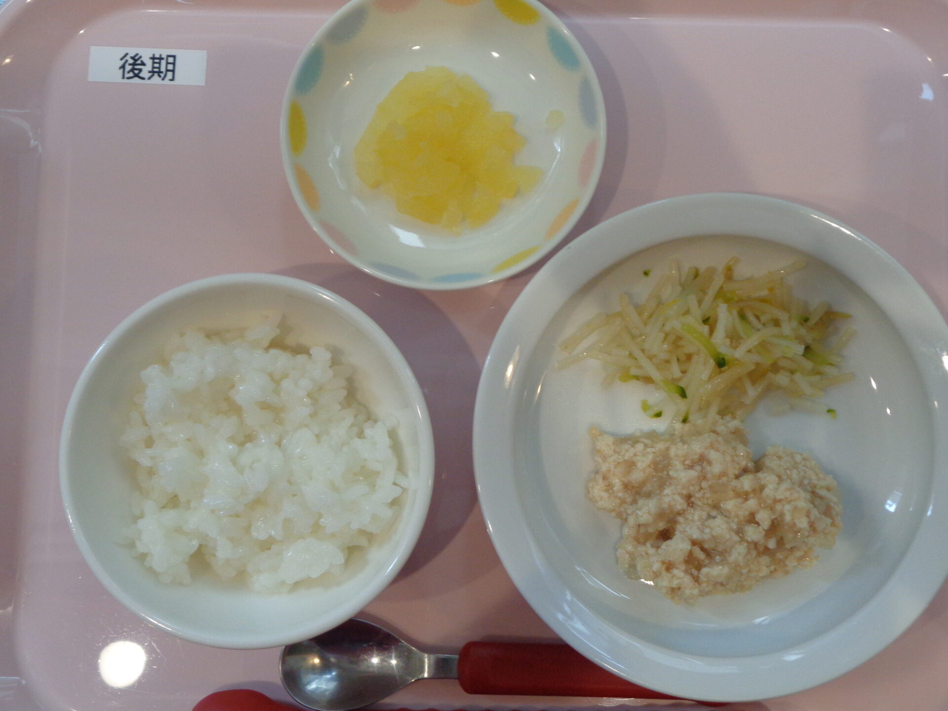 2024.05.08 給食写真 2024年5月8日 給食 【普通食】 ごはん・新ごぼうと豚肉の味噌煮・春雨のさっぱり和え・白菜とえのきのすまし汁・リンゴ缶 【離乳食・後期】 軟飯・鶏と大根の煮物・春雨サラダ・リンゴ缶 一覧へ戻る