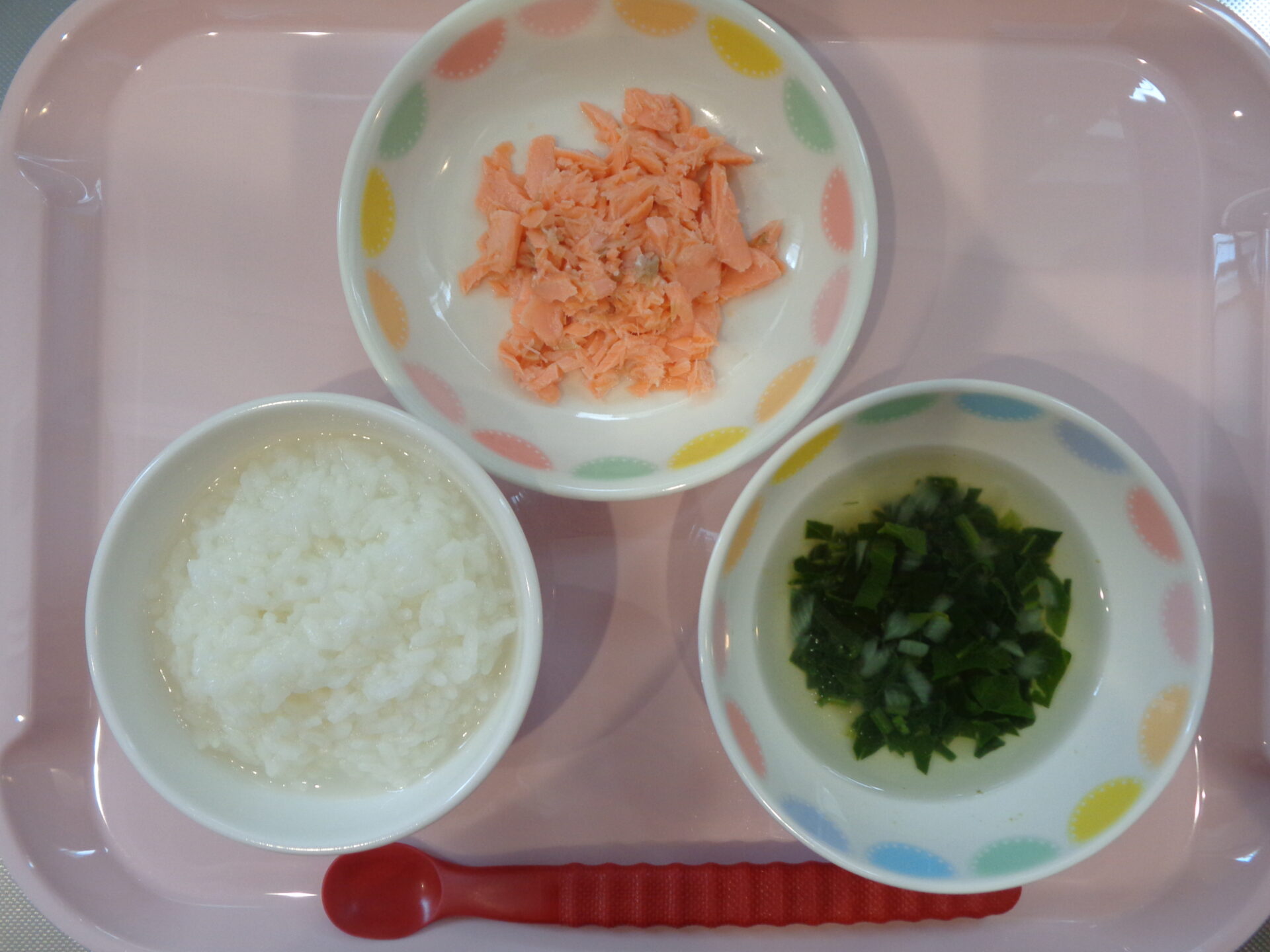 七倍がゆ・鮭の煮物・ほうれん草のスープ