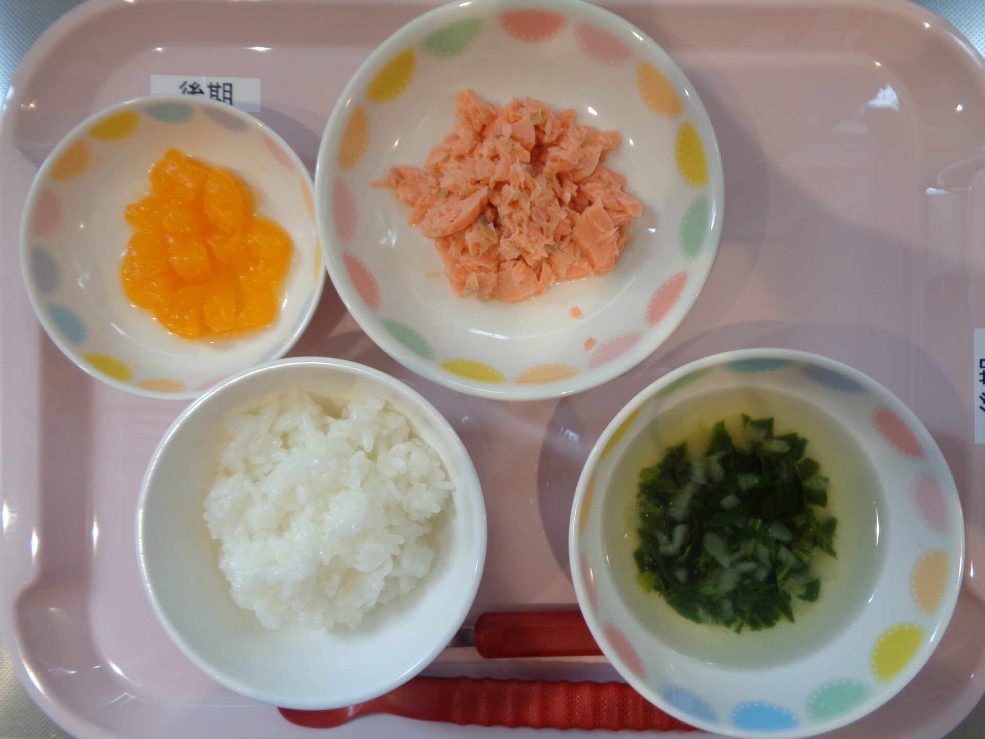 軟飯・鮭の煮物・ほうれん草のスープ・みかん缶