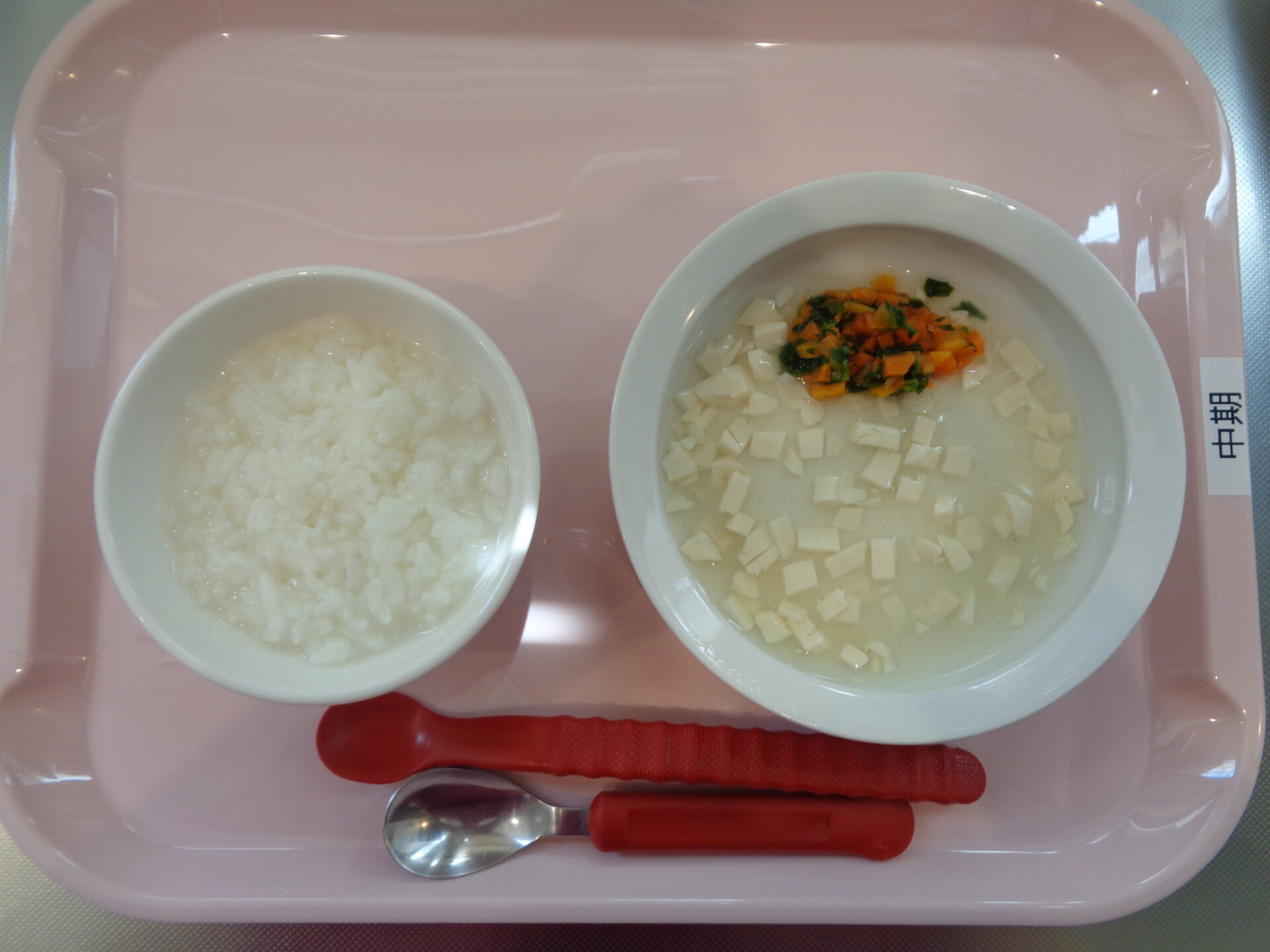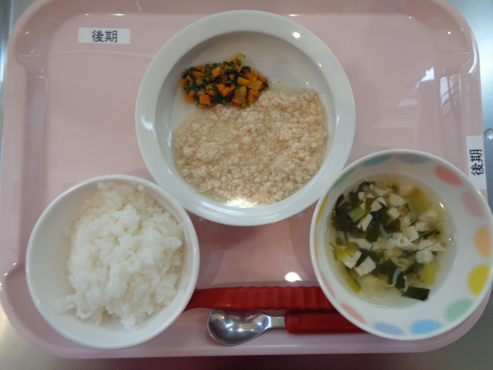 2024.06.05 給食写真 2024年6月5日 給食 【普通食】 ごはん・鶏の塩焼き・卯の花炒り・中華スープ 【離乳食・後期】 軟飯・鶏の煮物・ほうれん草の煮びたし・中華スープ 【離乳食・中期】 七倍がゆ・豆腐の煮物・ほうれん草とにんじんの煮物 一覧へ戻る