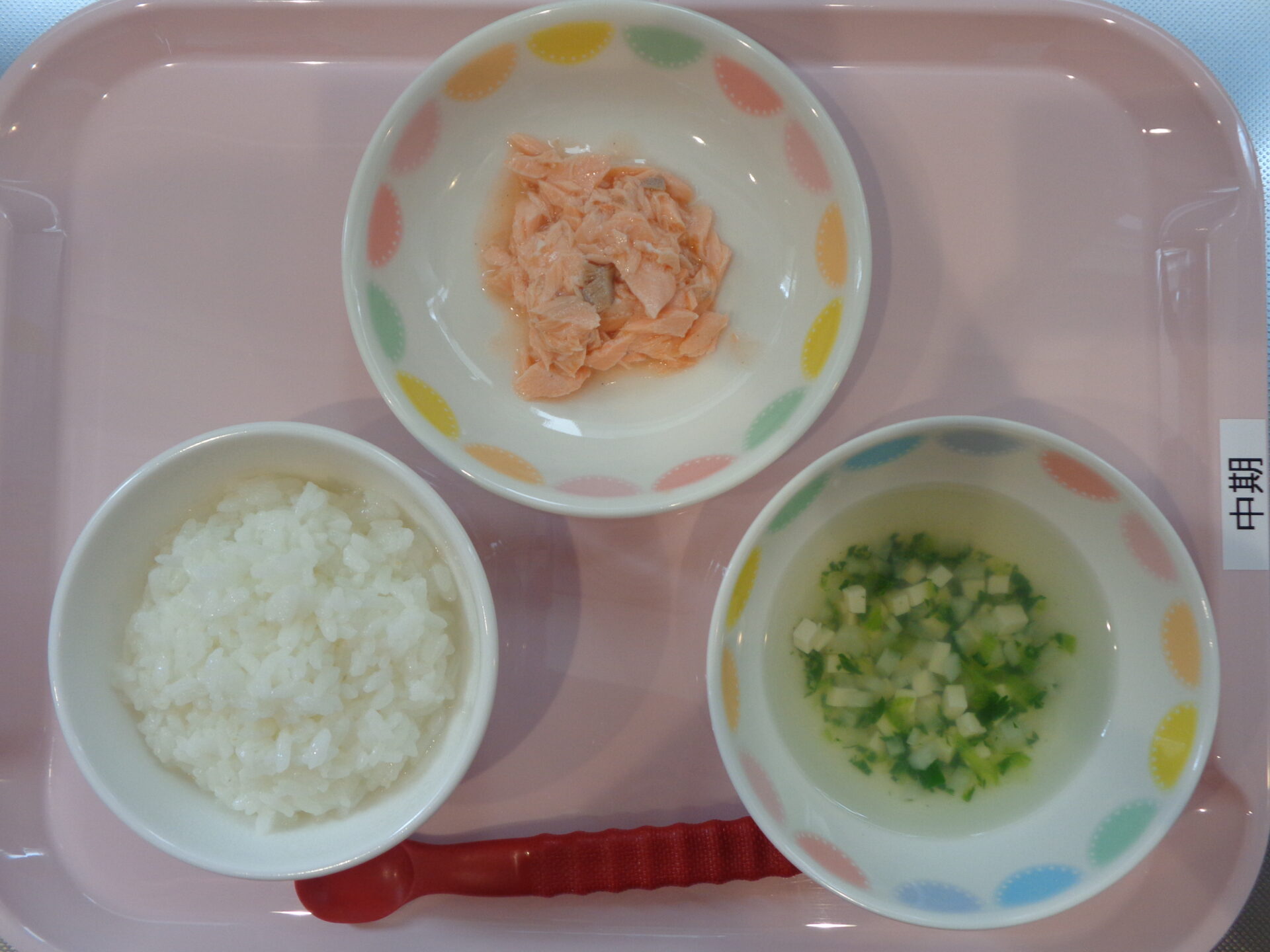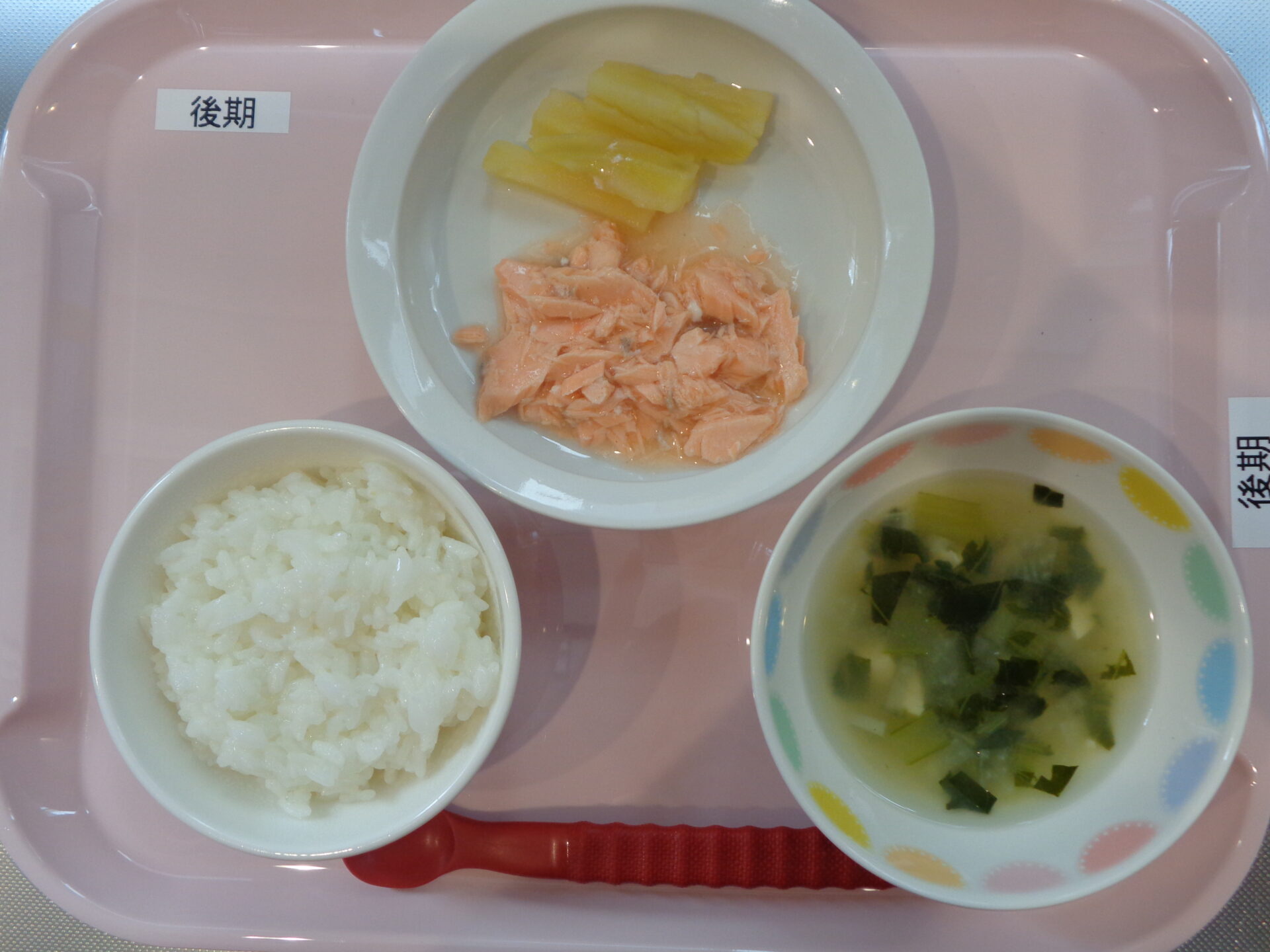 2024.06.10 給食写真 2024年6月10日 給食 【普通食】 ゆかりごはん・魚の塩麴焼き・さつま芋のサラダ・味噌汁 【離乳食・後期】 軟飯・鮭の煮物・さつま芋スティック・味噌汁 【離乳食・中期】 七倍がゆ・鮭の煮物・豆腐と大根のスープ 一覧へ戻る