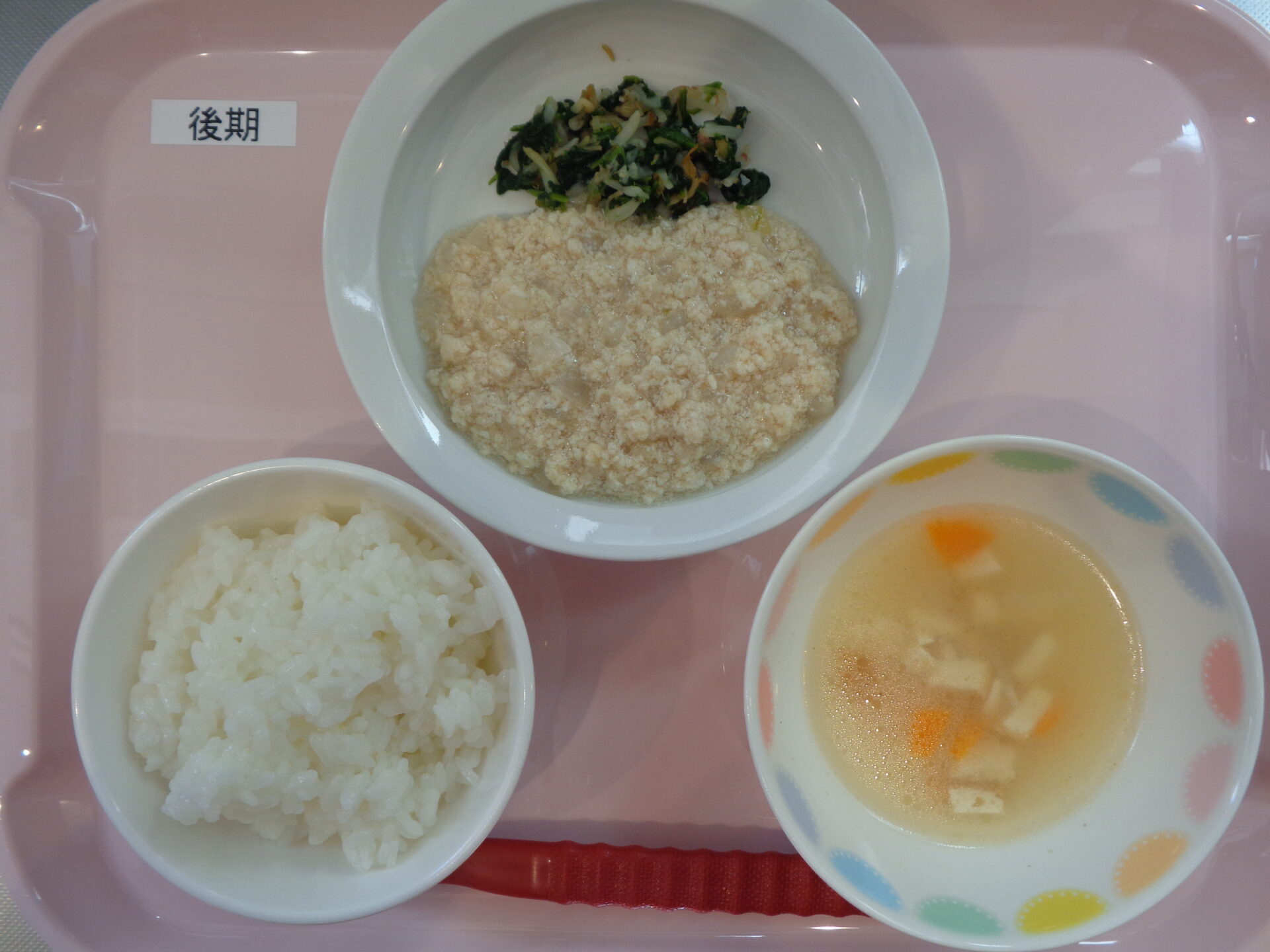 軟飯・鶏ひき肉とやさいの煮物・ほうれん草ともやしのおかか和え・すまし汁