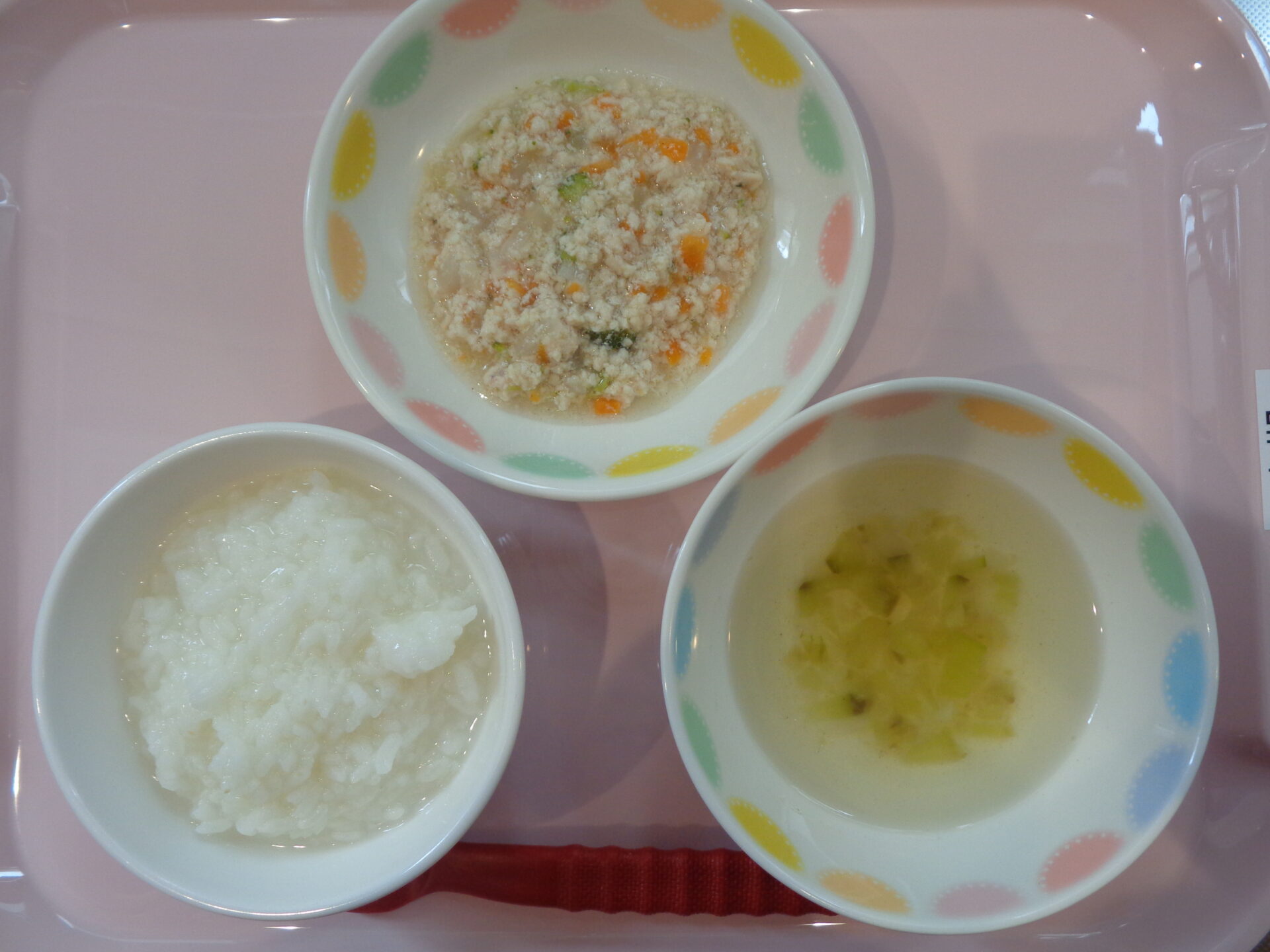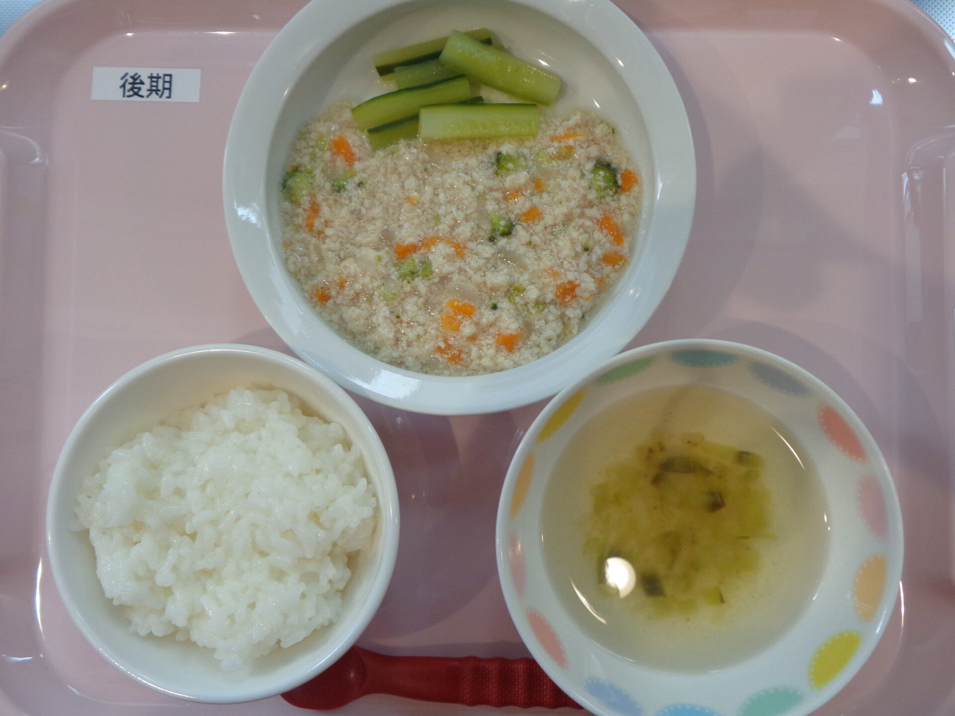 軟飯・鶏ひき肉と野菜の煮物・スティックきゅうり・なすのスープ