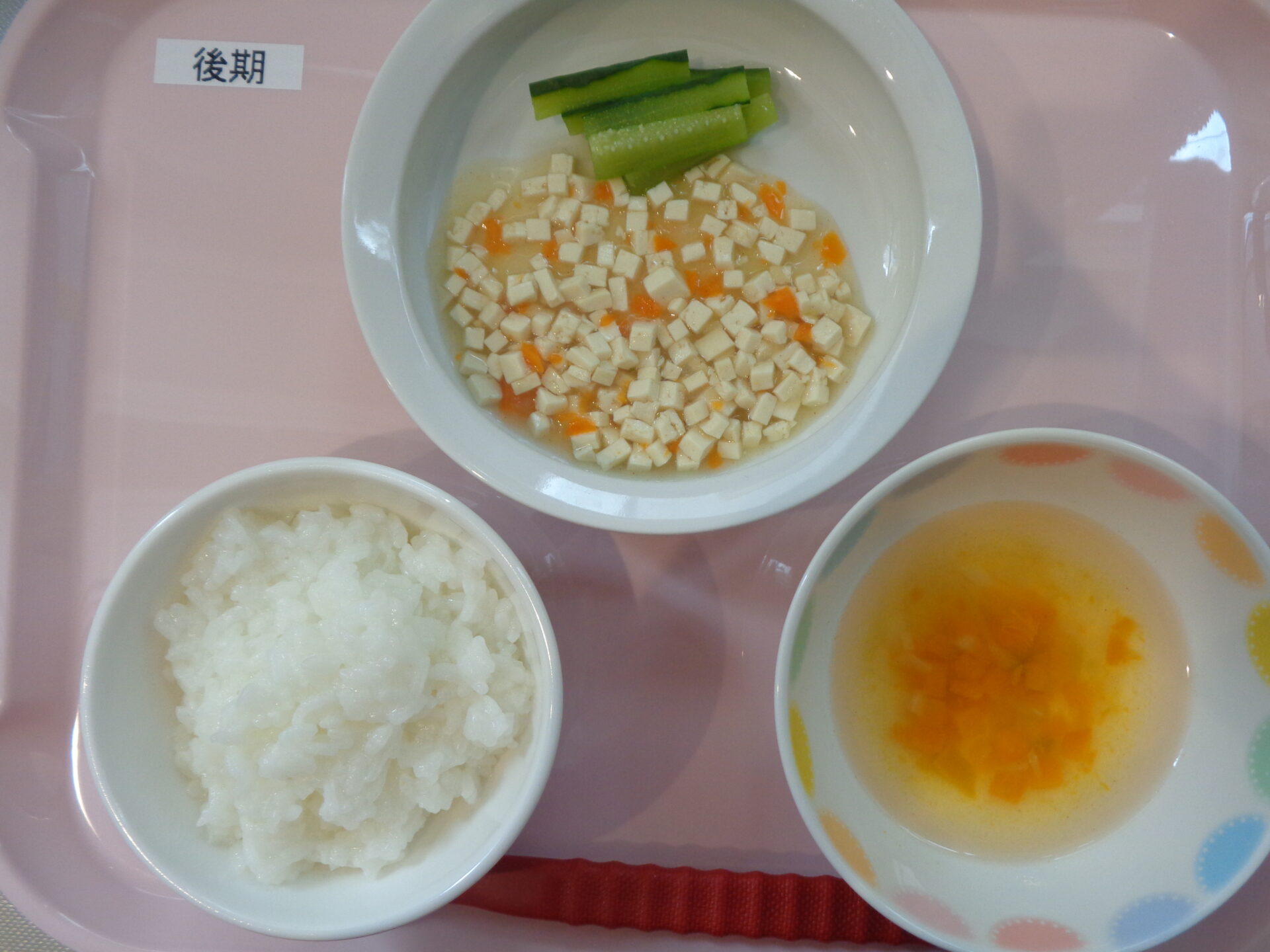 軟飯・豆腐と野菜の旨煮・スティックきゅうり・かぼちゃのスープ