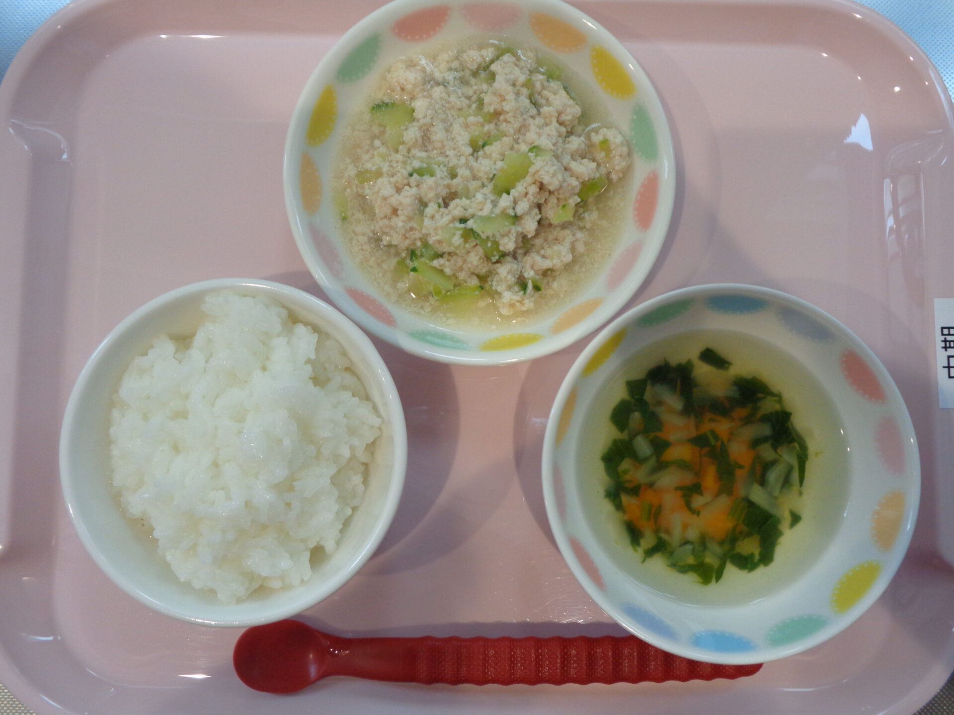 2024.06.24 給食写真 2024年6月24日 給食 【普通食】 ごはん・鶏肉の胡麻味噌焼き・スパゲッティサラダ・すまし汁 【離乳食・中期】 七倍がゆ・鶏ささみときゅうりの煮物・かぼちゃとほうれん草のスープ 一覧へ戻る