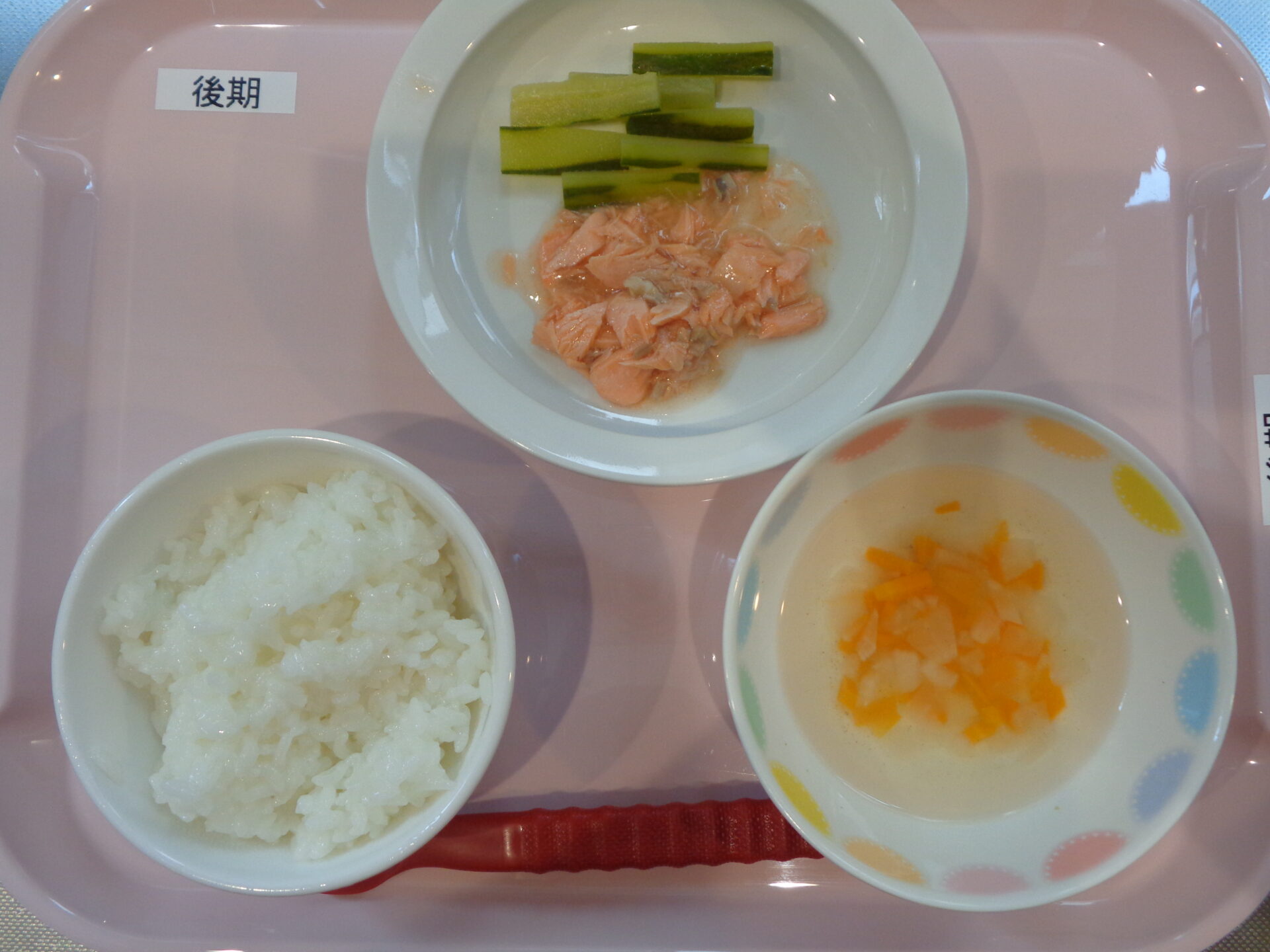 2024.07.02 給食写真 2024年7月2日 給食 【普通食】 ごはん・魚の塩焼き・きやべつとコーンの和え物・のっぺい汁 【離乳食・後期】 ごはん・魚の煮物・きゅうりスティック・だいこんとにんじんのスープ 一覧へ戻る