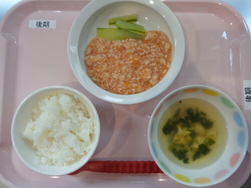 2024.07.18 給食写真 7月18日 給食 【普通食】 ・チキンライス ・ツナサラダ ・マカロニスープ 【後期食】 ・ごはん ・鶏と野菜のトマト煮 ・きゅうりスティック ・マカロニスープ 一覧へ戻る