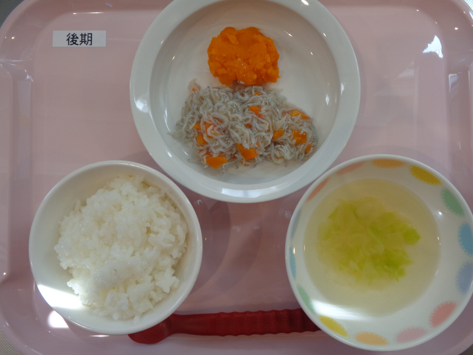2024.07.22 給食写真 2024年7月22日 給食 【普通食】 ごはん・鶏肉のパン粉焼き・かぼちゃのサラダ・すまし汁 【離乳食・後期】 ごはん・しらすとにんじんの煮物・かぼちゃのマッシュ・きやべつのすまし汁 一覧へ戻る