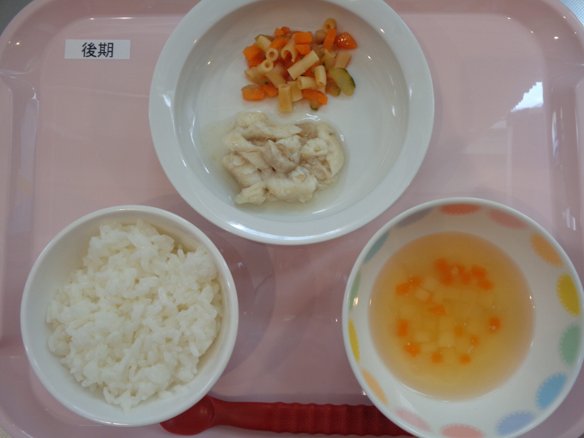 2024.07.25 給食写真 2024年7月25日 給食(お誕生会) 【普通食】 ふりかけご飯・とりの唐揚げ・マカロニサラダ・コンソメスープ・ヤクルト 【離乳食・後期】 ごはん・魚の煮物・マカロニと野菜のケチャップ煮・コンソメスープ 一覧へ戻る