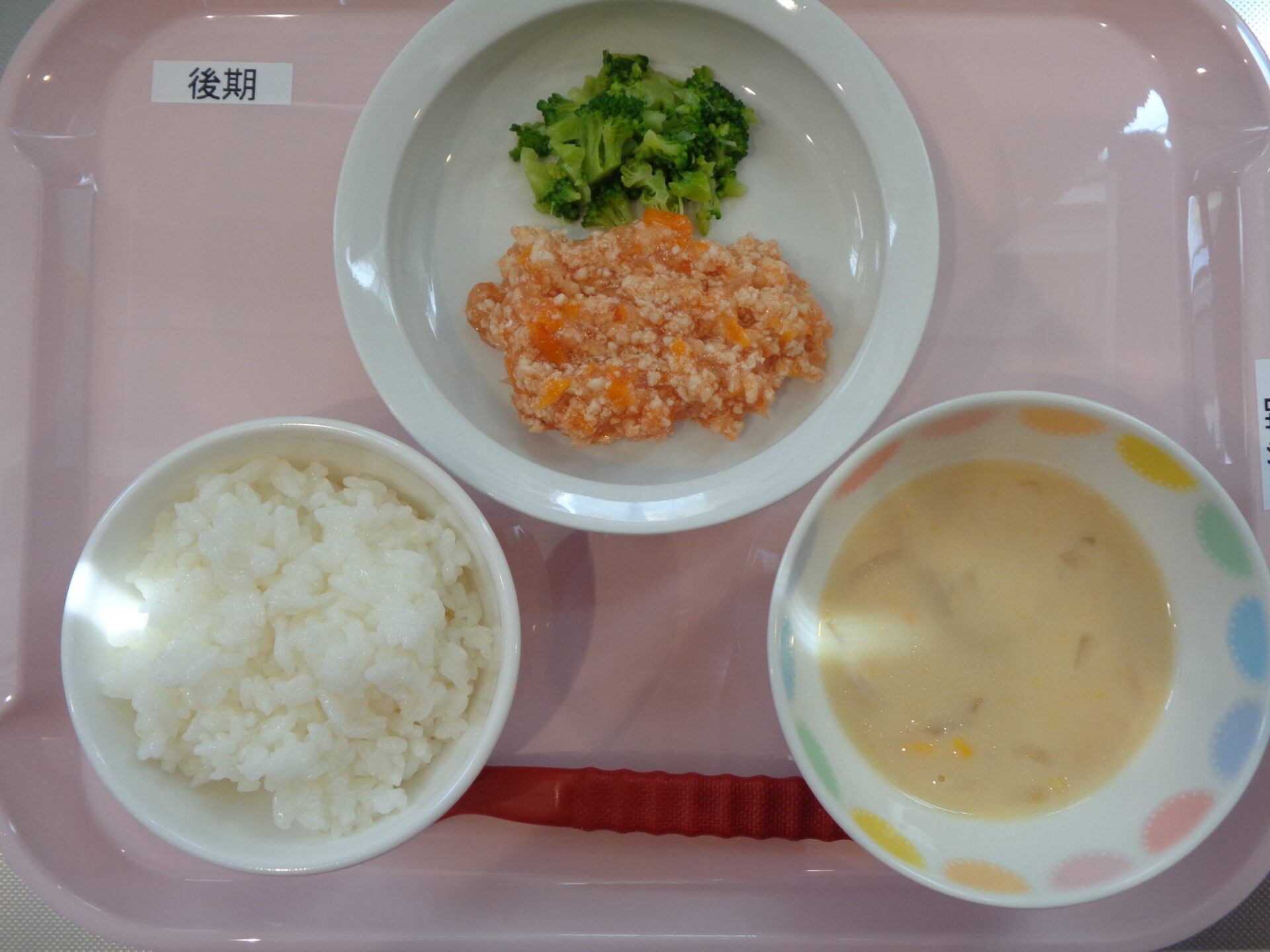 2024.07.26 給食写真 2024年7月26日 給食 【普通食】 ミートスパゲティ・ブロッコリーと人参のサラダ・コーンスープ 【離乳食・後期】 ごはん・鶏と野菜のトマト煮・ゆでブロッコリー・コーンスープ 一覧へ戻る
