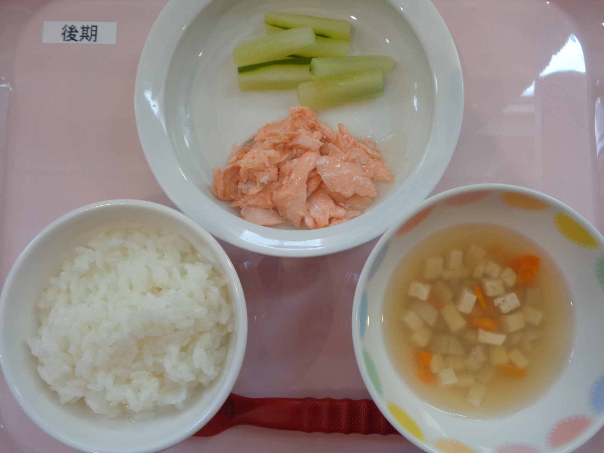 2024.08.05 給食写真 2024年8月5日 給食 【普通食】 ごはん・魚の味噌焼き・春雨サラダ・けんちん汁 【離乳食・後期】 ごはん・鮭のやわらか煮・きゅうりスティック・豆腐と里芋のすまし汁 一覧へ戻る