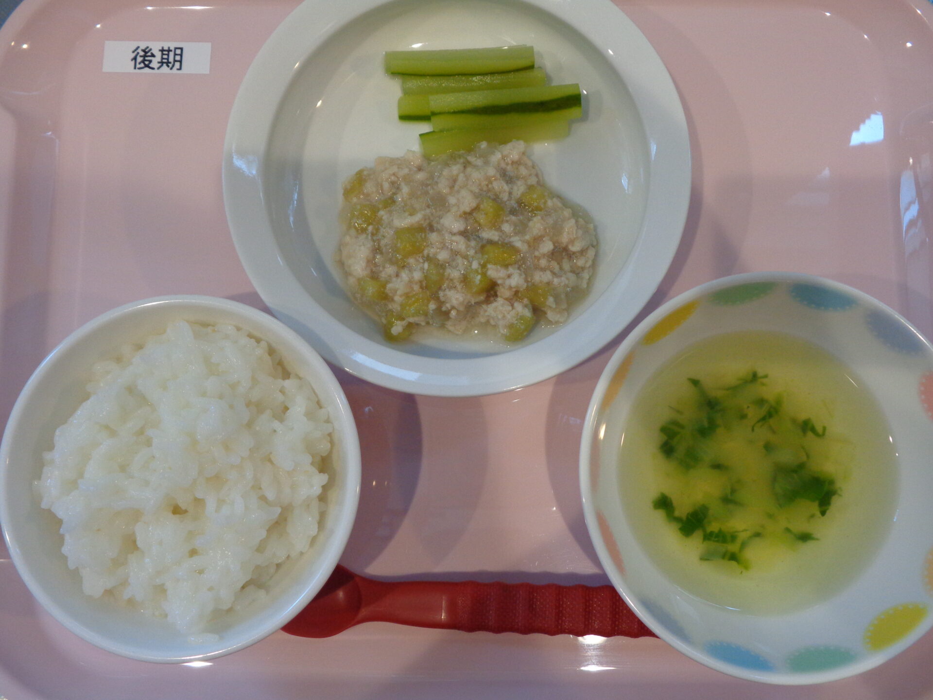 2024.08.07 給食写真 2024年8月7日 給食 【普通食】 ごはん・豚と夏野菜の炒め物・もやしときゅうりのナムル・たまごスープ 【離乳食・後期】 ごはん・ささみとなすの煮物・きゅうりスティック・青梗菜のスープ 一覧へ戻る
