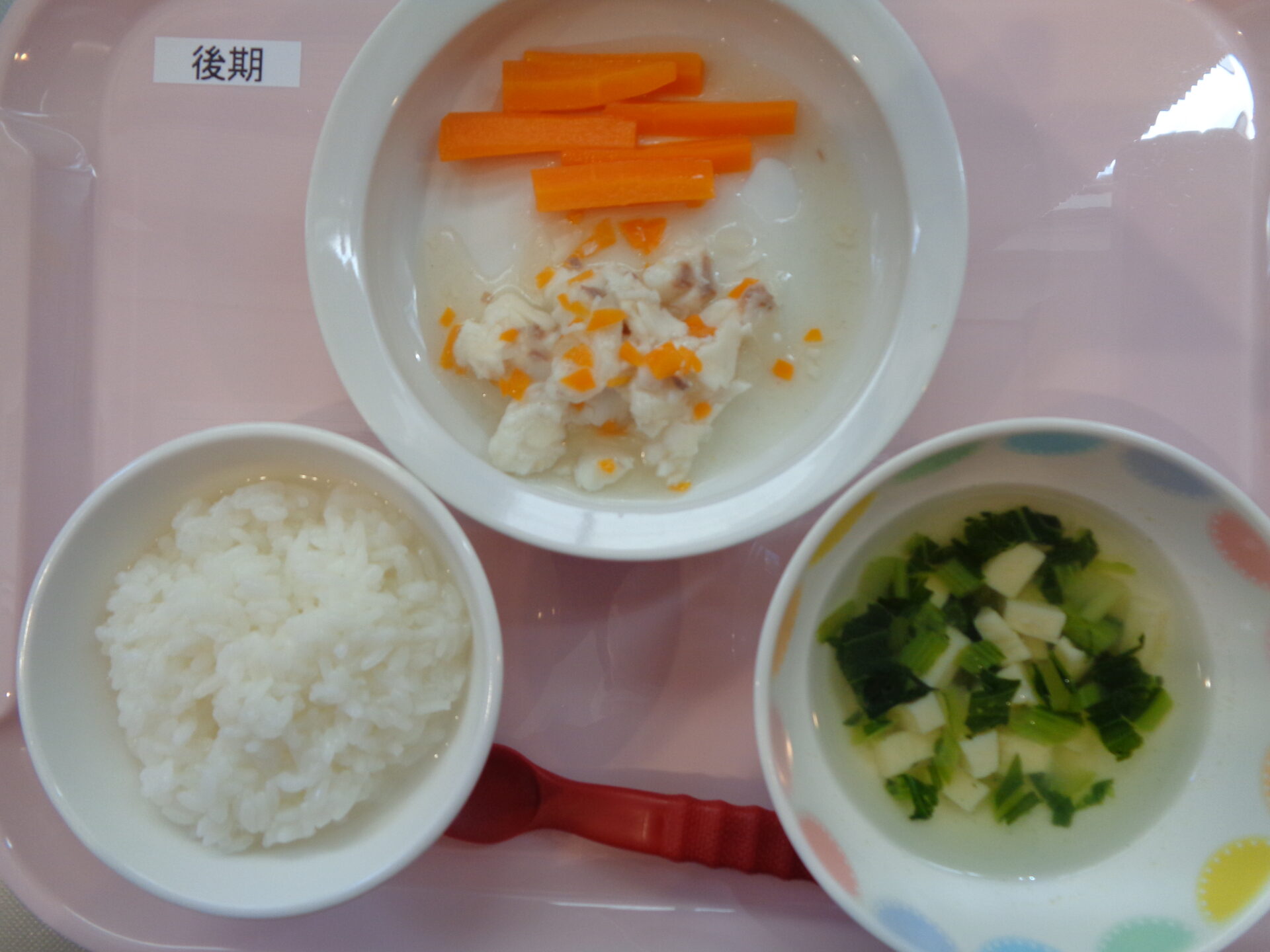 2024.08.08 給食写真 2024年8月8日 給食 【普通食】 ごはん・魚の中華あんかけ・マカロニサラダ・豆腐の味噌汁 【離乳食・後期】 ごはん・魚の野菜あんかけ・にんじんスティック・豆腐のスープ 一覧へ戻る