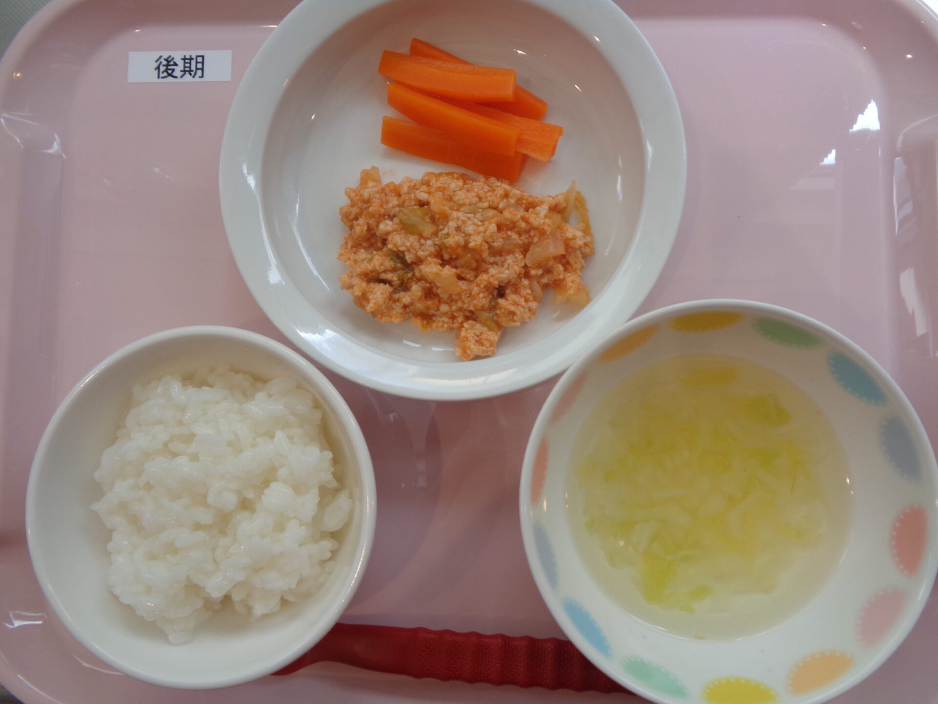 2024.08.21 給食写真 2024年8月21日 給食 【普通食】 ごはん・魚のオーロラソース・チキンサラダ・春雨スープ 【離乳食・後期】 ごはん・鶏のトマト煮・にんじんスティック・白菜のスープ 一覧へ戻る