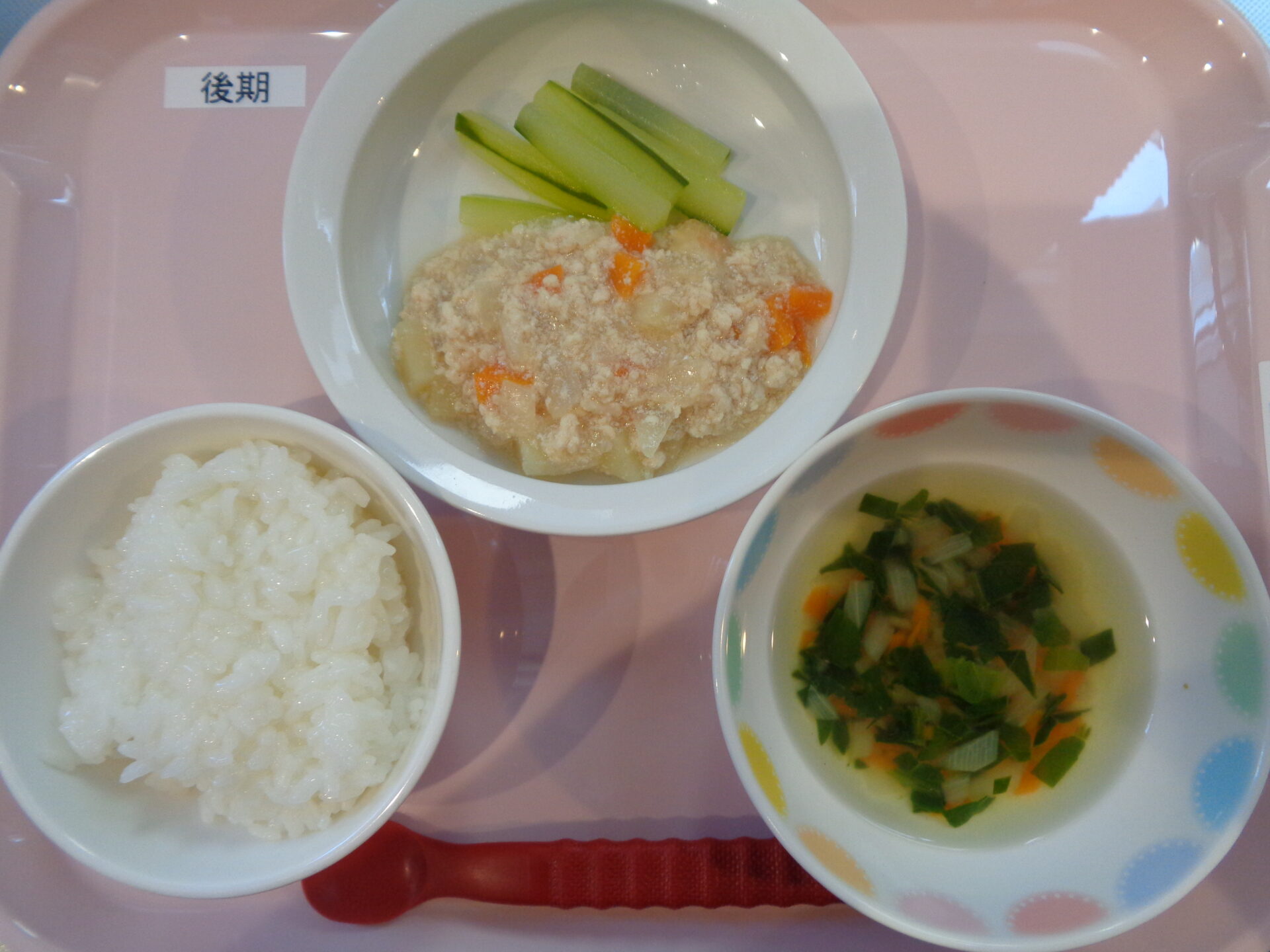 2024.08.27 給食写真 2024年8月27日 【普通食】 チキンカレー・豆乳スープ・もやしとごまみそサラダ・オレンジゼリー 【離乳食・後期】 ごはん・鶏じゃが・きゅうりスティック・ほうれん草のスープ 一覧へ戻る