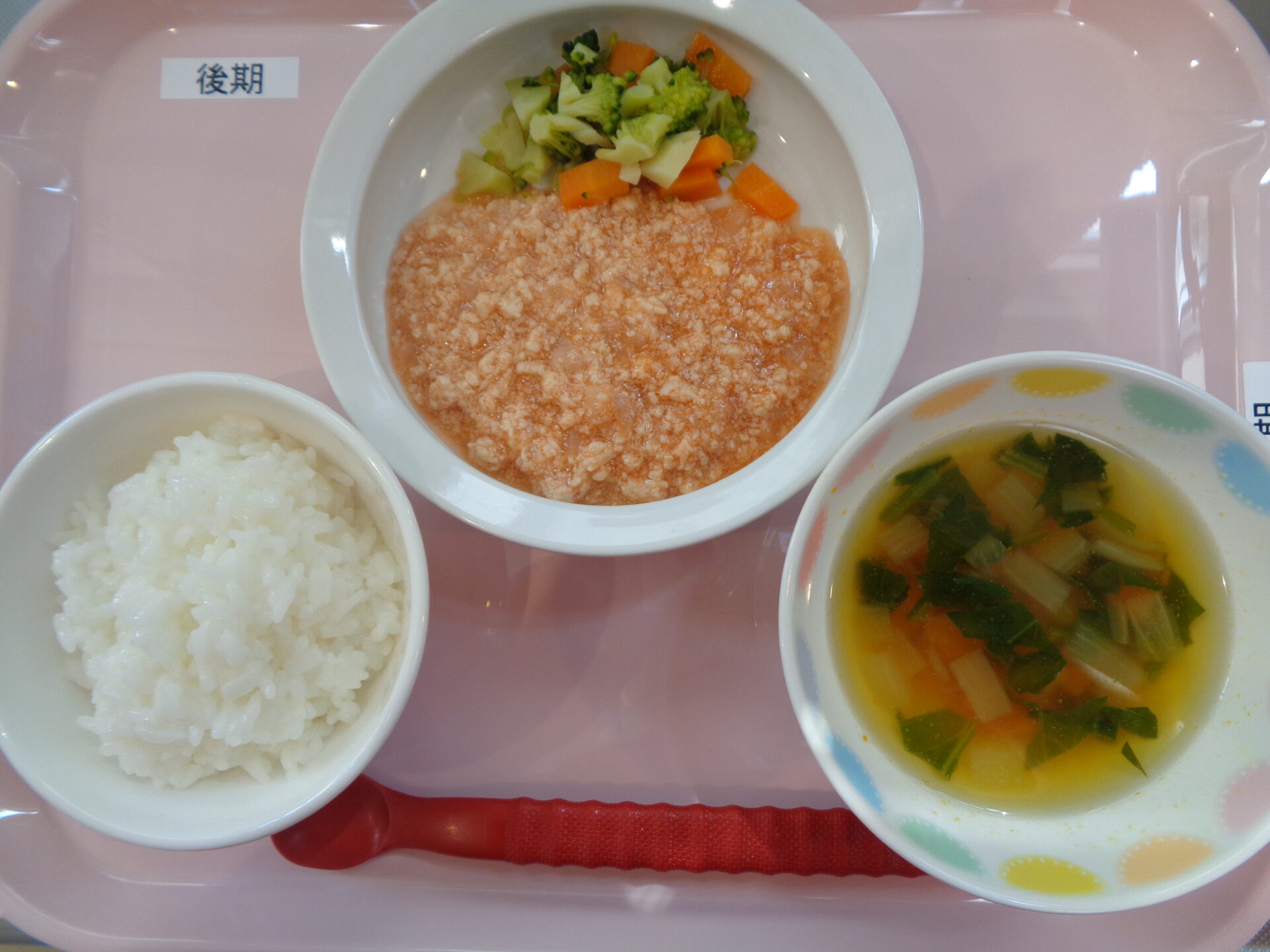 2024.09.03 給食写真 2024年9月3日 給食 【普通食】 ごはん・ポークチャップ・切り干し大根サラダ・野菜スープ 【離乳食・後期】 軟飯・鶏のトマト煮・ゆでブロッコリー・野菜スープ 一覧へ戻る