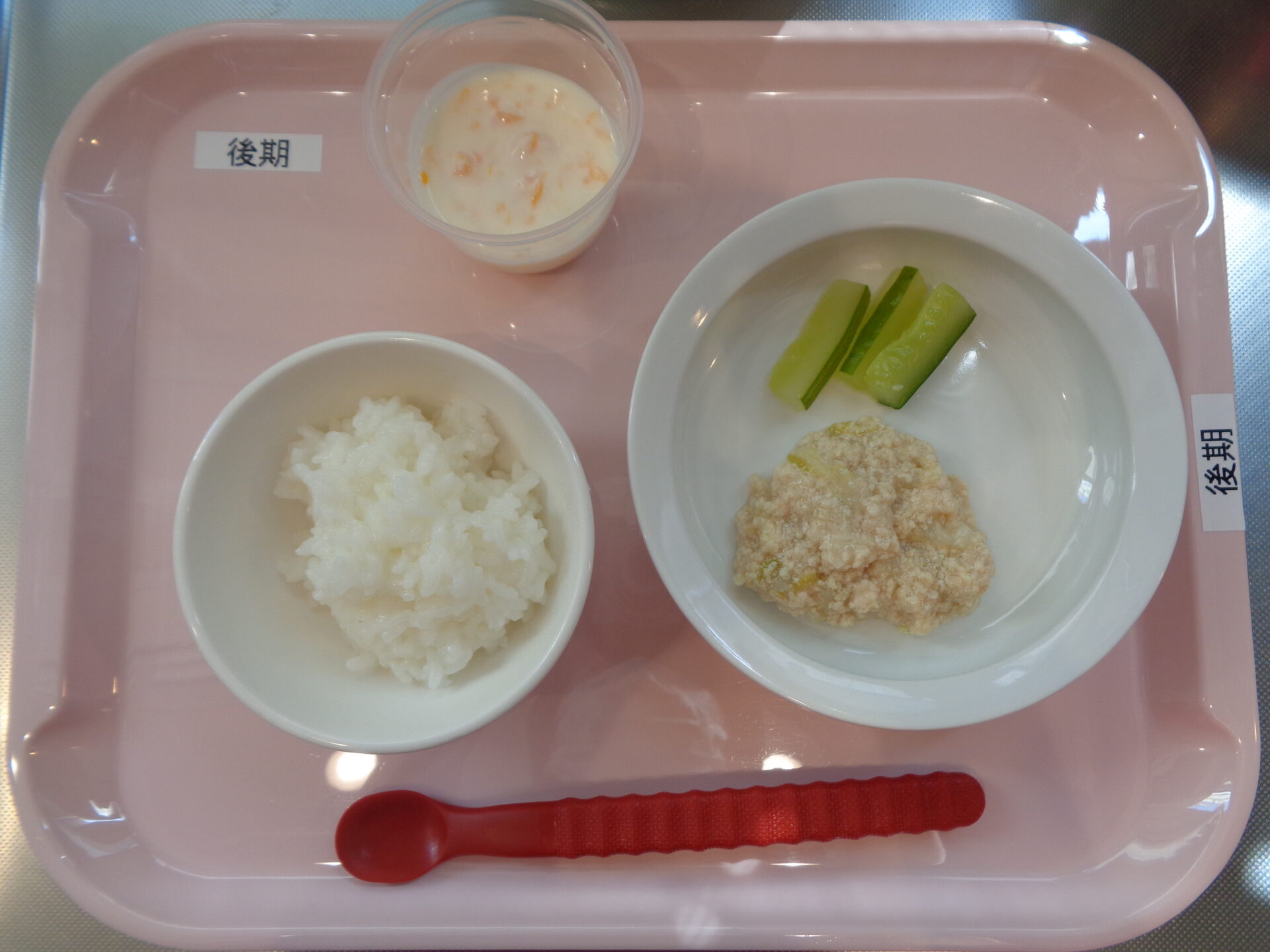 軟飯・ささみとキャベツの煮物・きゅうりスティック・みかんヨーグルト