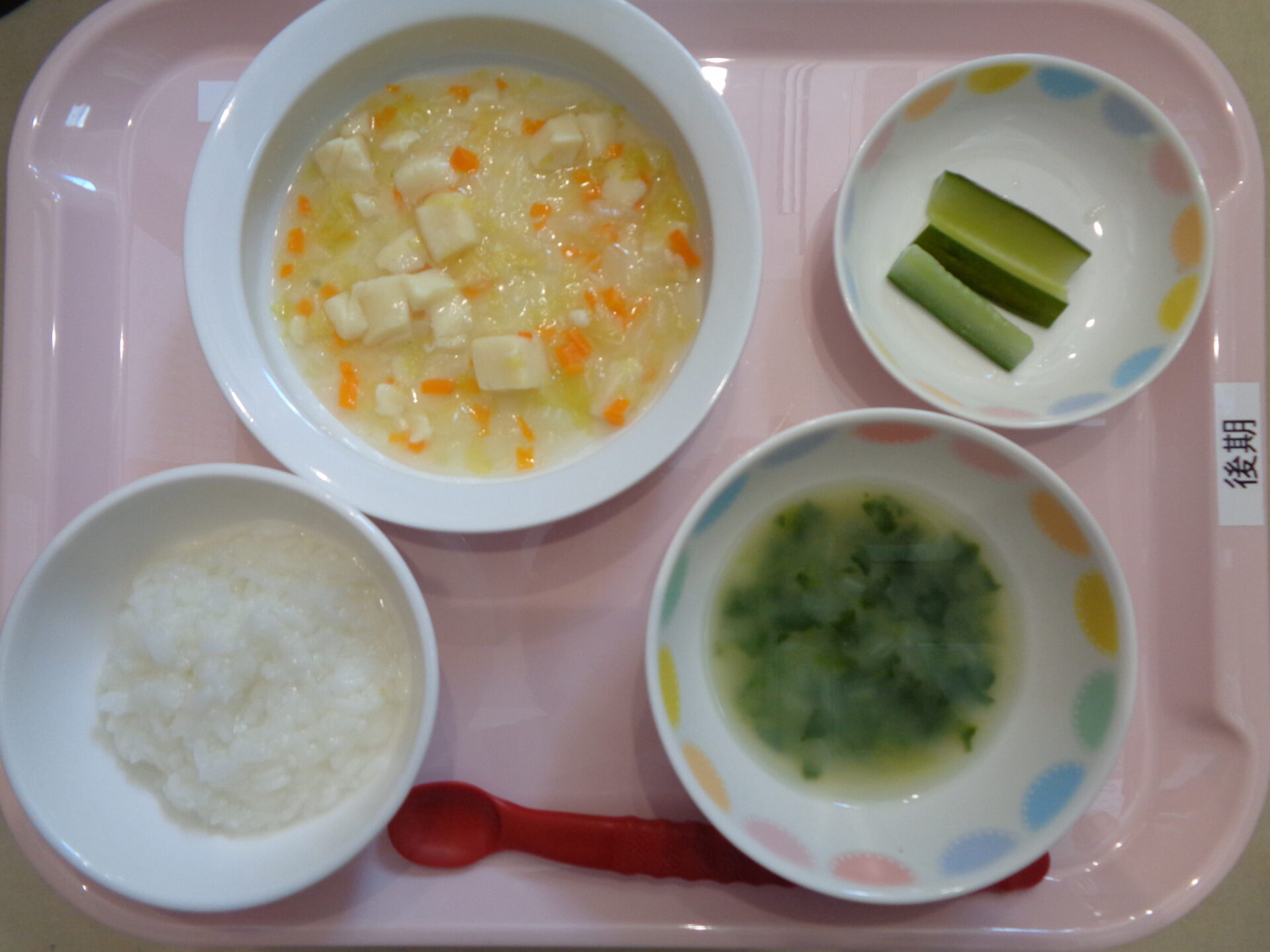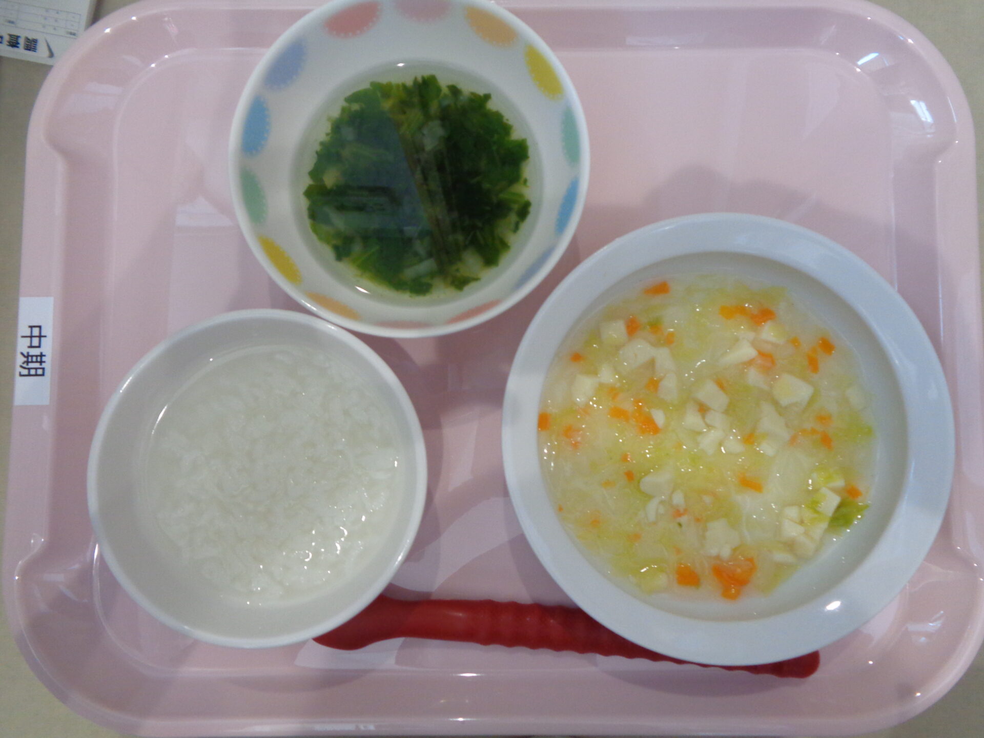 おかゆ・豆腐と野菜の煮物・ほうれん草スープ