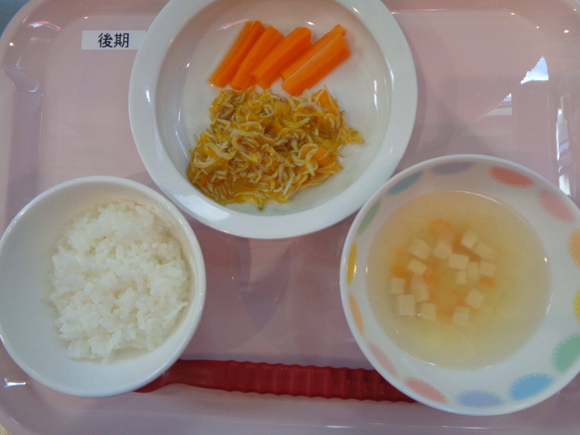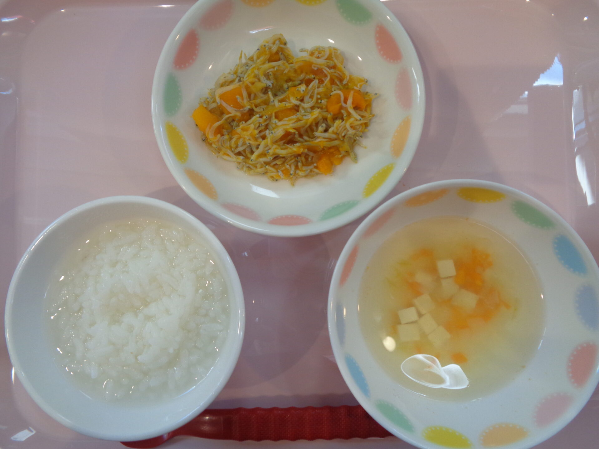 軟飯・しらすとかぼちゃの煮物・にんじんスティック・とうふのすまし汁