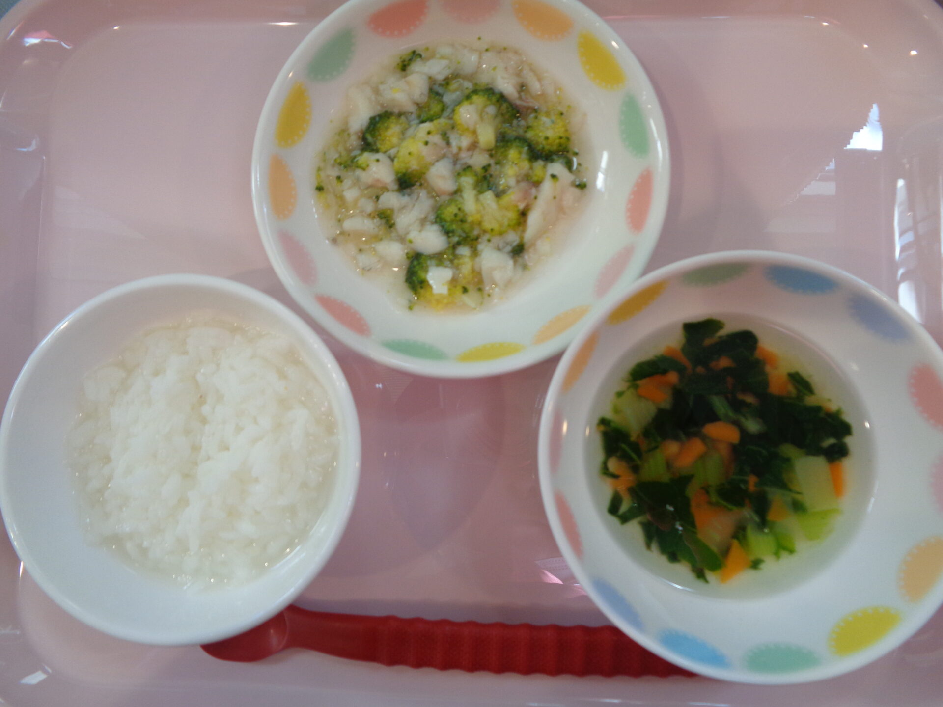 おかゆ・魚とブロッコリーの煮物・ほうれん草のスープ