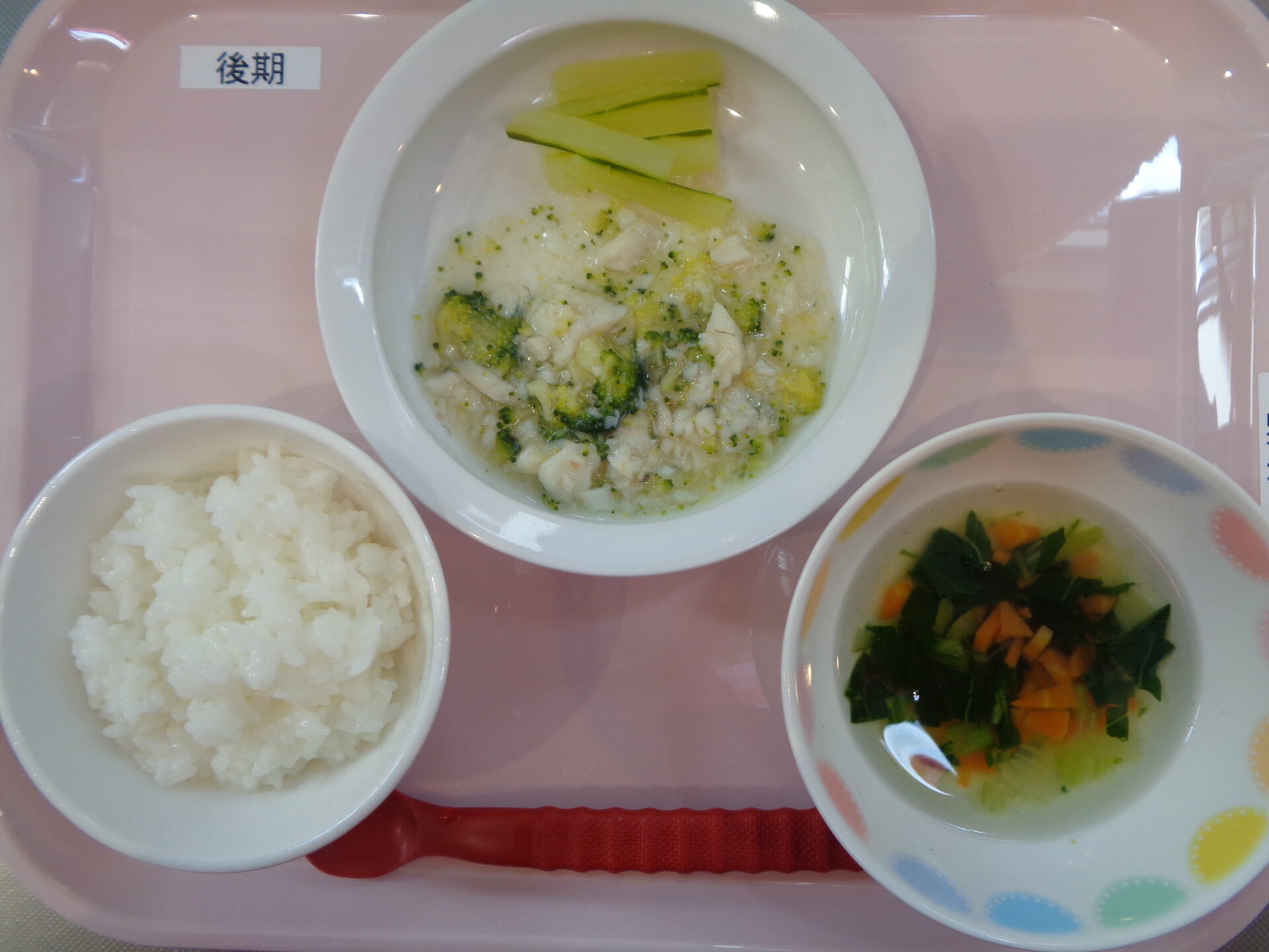 軟飯・さかなとブロッコリーの煮物・きゅうりスティック・ほうれん草のスープ