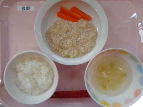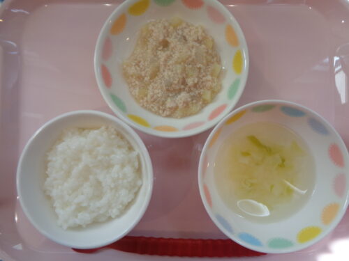 2024.09.24 給食写真 9月24日(火) 給食 【普通食】 ・カレーライス ・レモンドレッシング和え ・もも缶 【後期食】 ・軟飯 ・鶏じゃが ・にんじんスティック ・キャベツのスープ 【中期食】 ・おかゆ ・鶏じゃが ・キャベツのスープ 一覧へ戻る