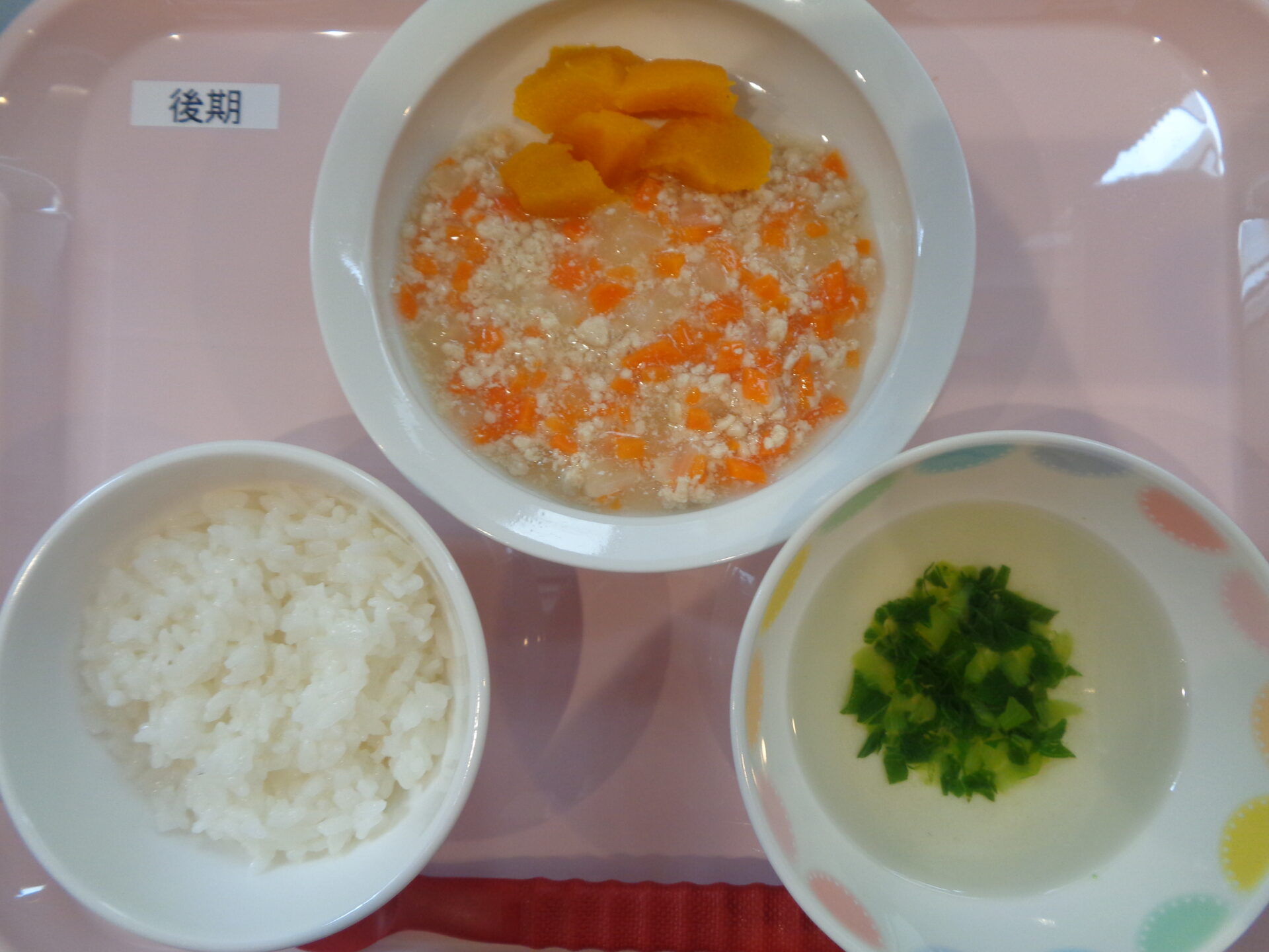 軟飯・豆腐と野菜の煮物・ゆでかぼちゃ・チンゲン菜のすまし汁