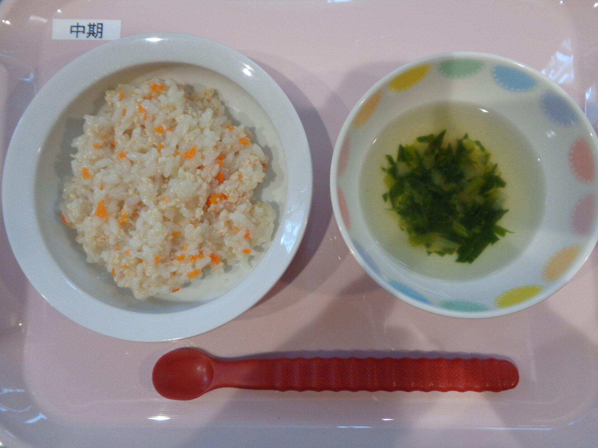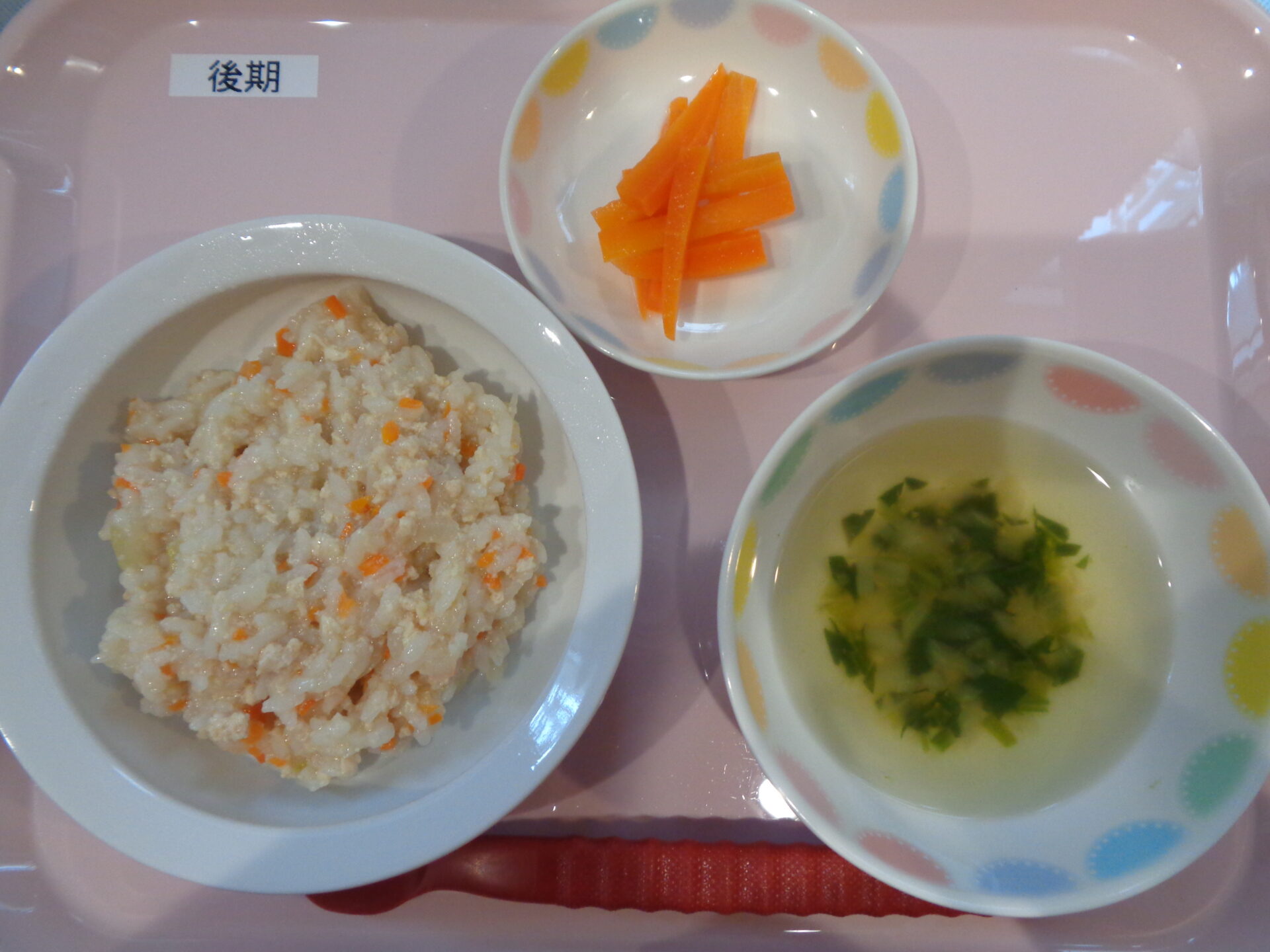 2024.10.08 給食写真 2024年10月8日 給食 【普通食】 チャーハン・ほうれん草の胡麻和え・中華風スープ 【離乳食・後期】 鶏と野菜の雑炊・にんじんスティック・ほうれん草のスープ 【離乳食・中期】 鶏と野菜の雑炊・ほうれん草のスープ 一覧へ戻る
