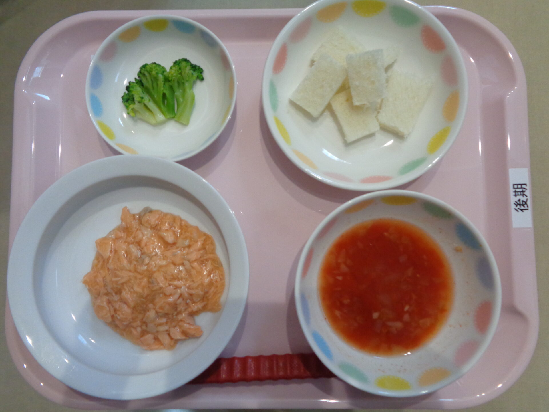 食パン・魚の煮物・ブロッコリーのやわらか煮・トマトスープ