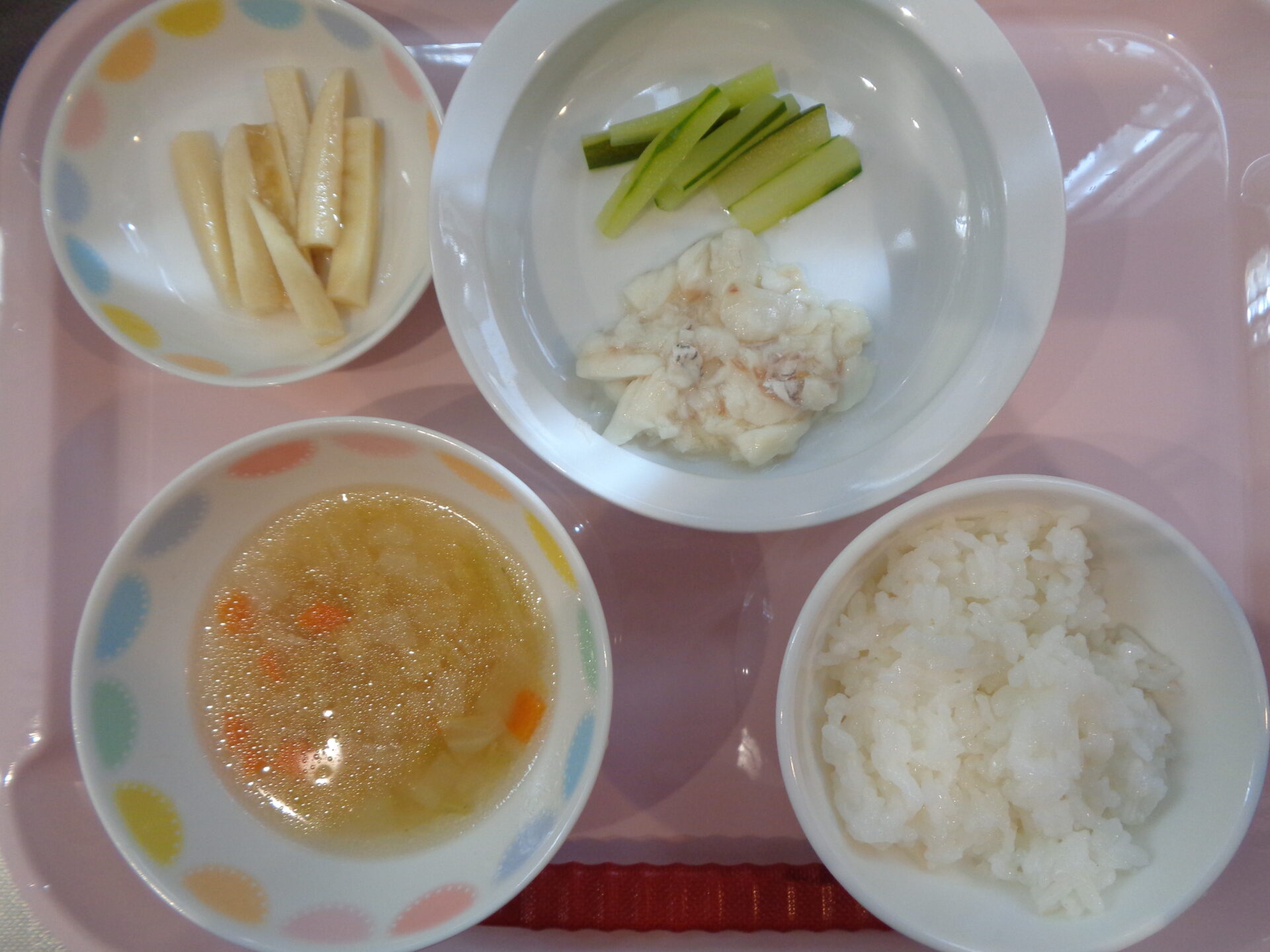 軟飯・・魚の煮物・きゅうりスティック・コンソメスープ・バナナ