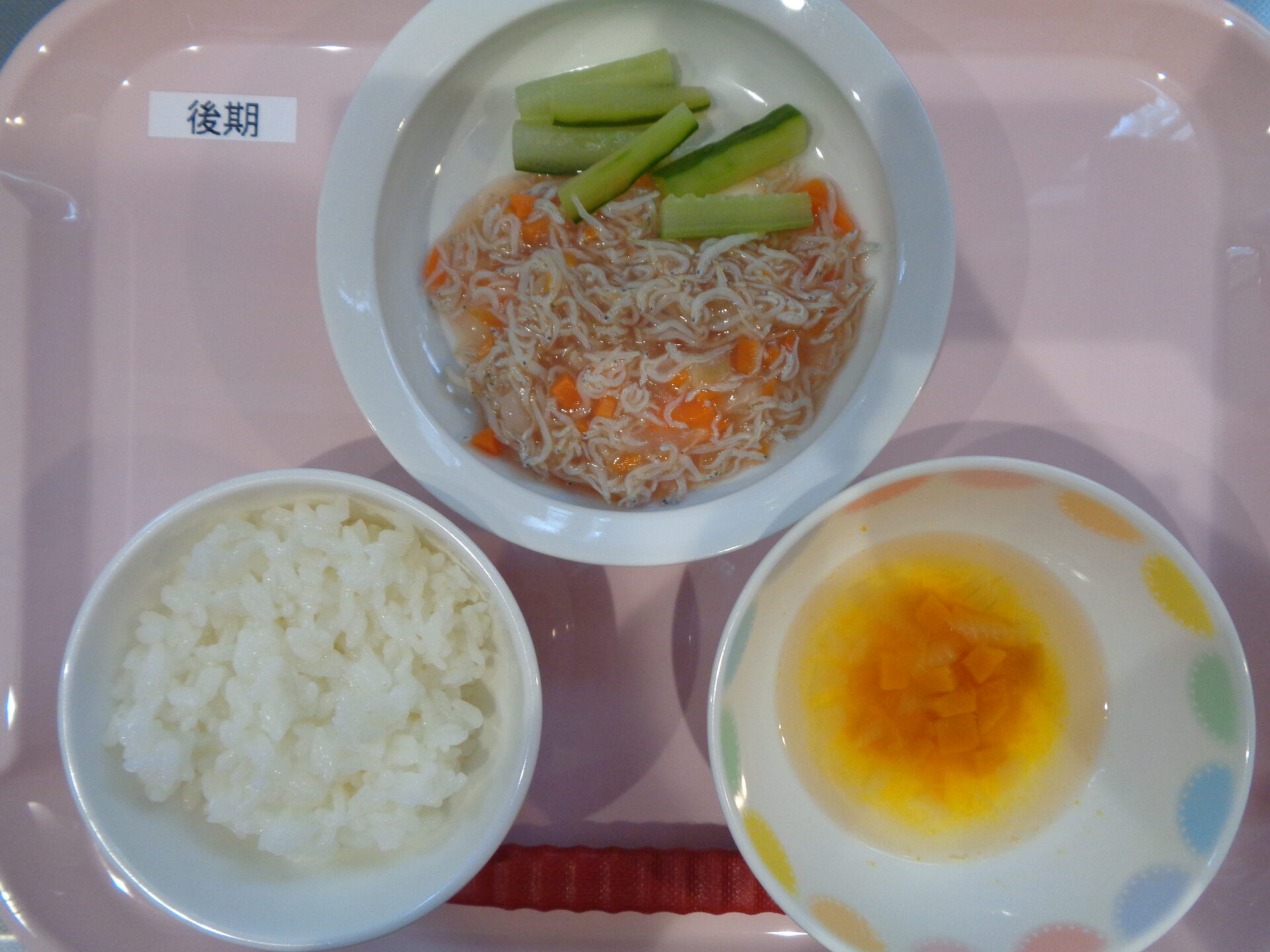 軟飯・しらすと野菜のトマト煮・きゅうりスティック・かぼちゃのスープ