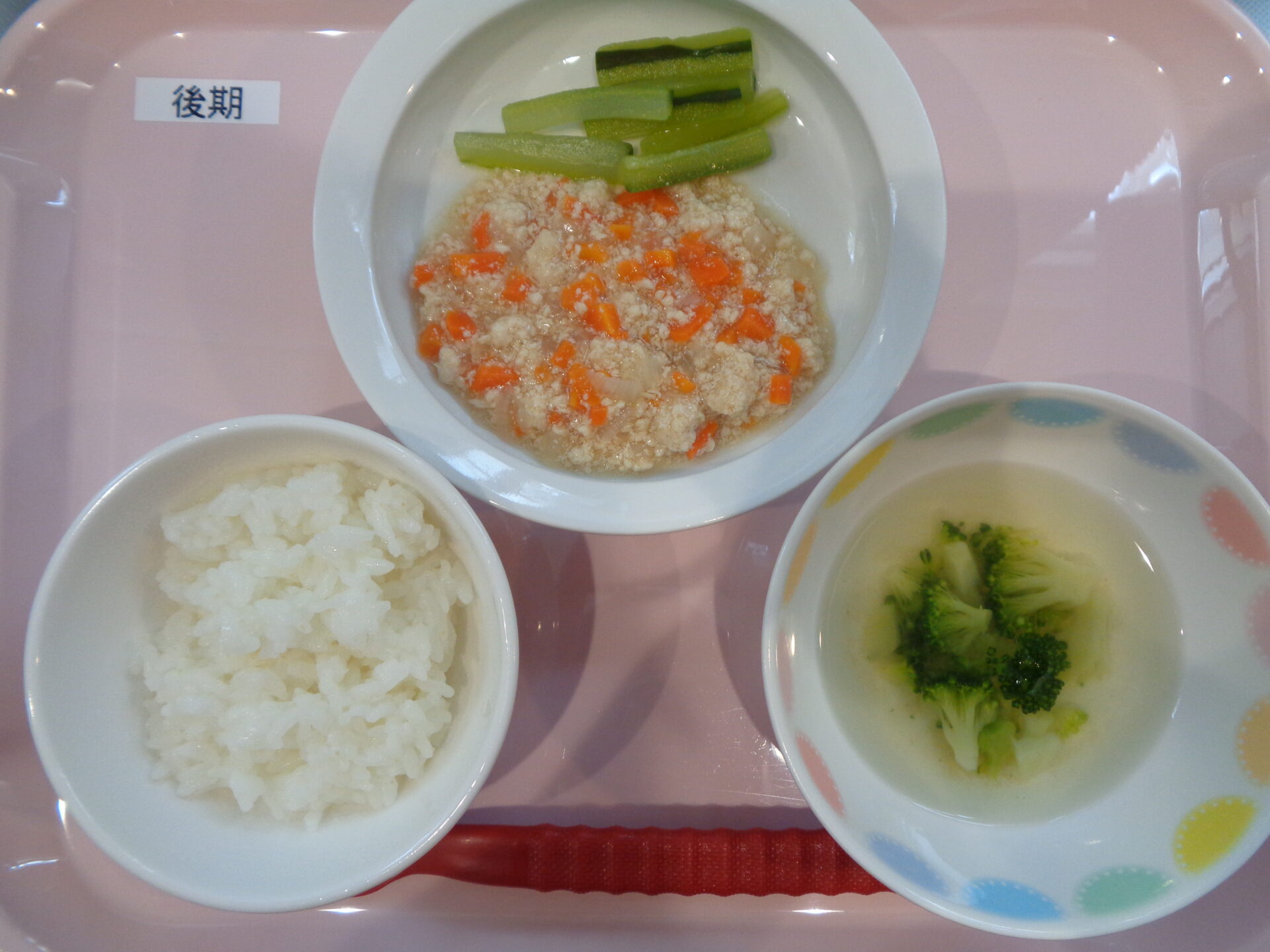 軟飯・ささみの旨煮・きゅうりスティック・ブロッコリースープ