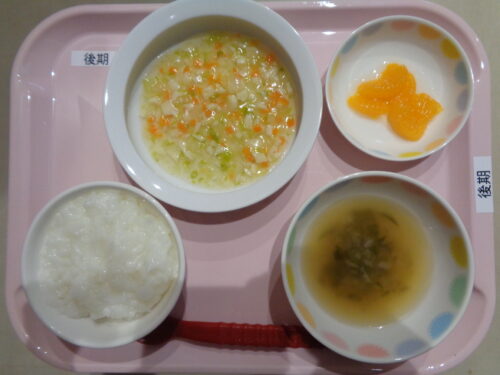 ・ごはん ・魚とキャベツの煮物 ・コンソメスープ ・みかん缶