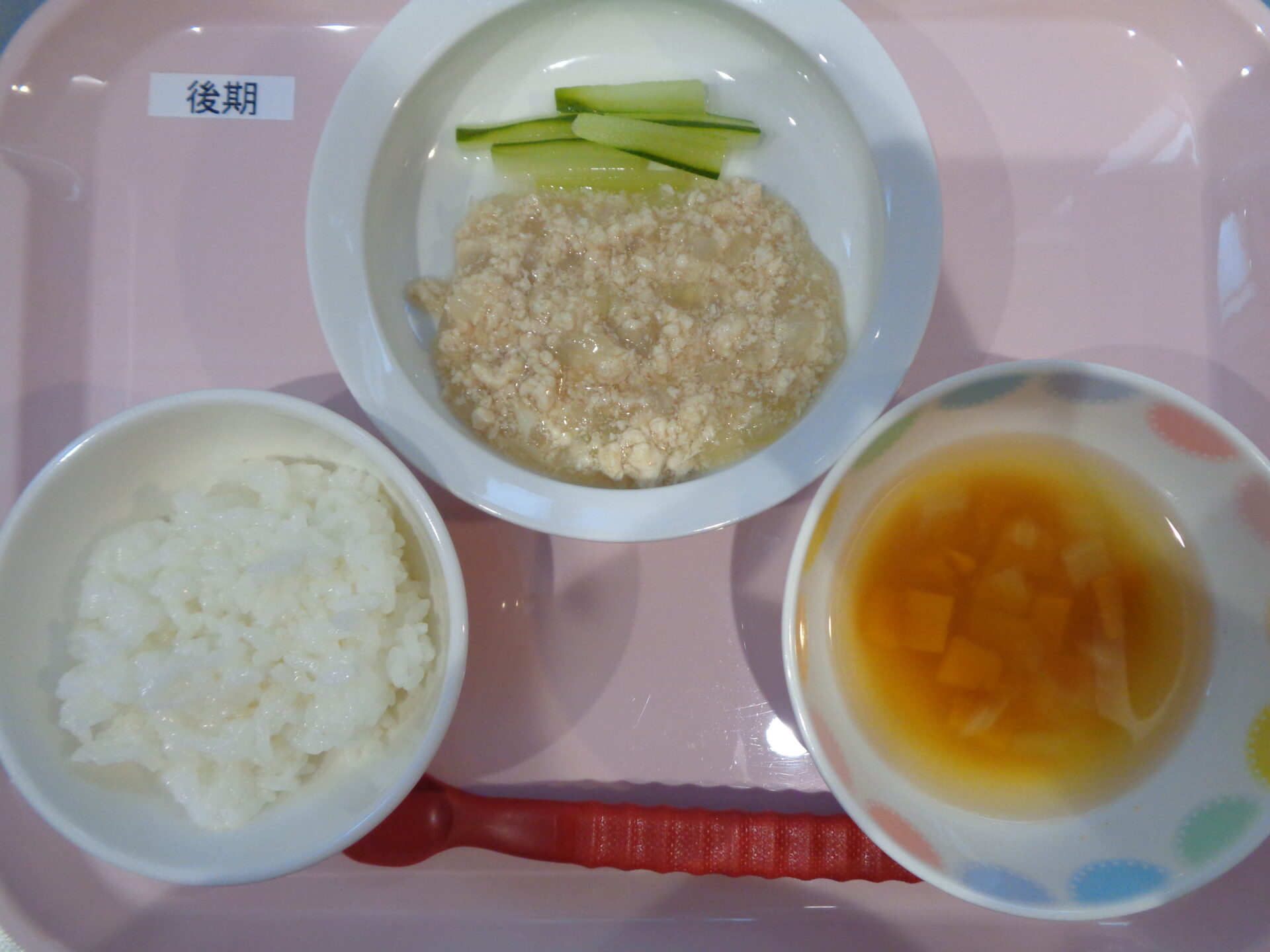 軟飯・ささみのケチャップ煮・きゅうりスティック・かぼちゃのスープ