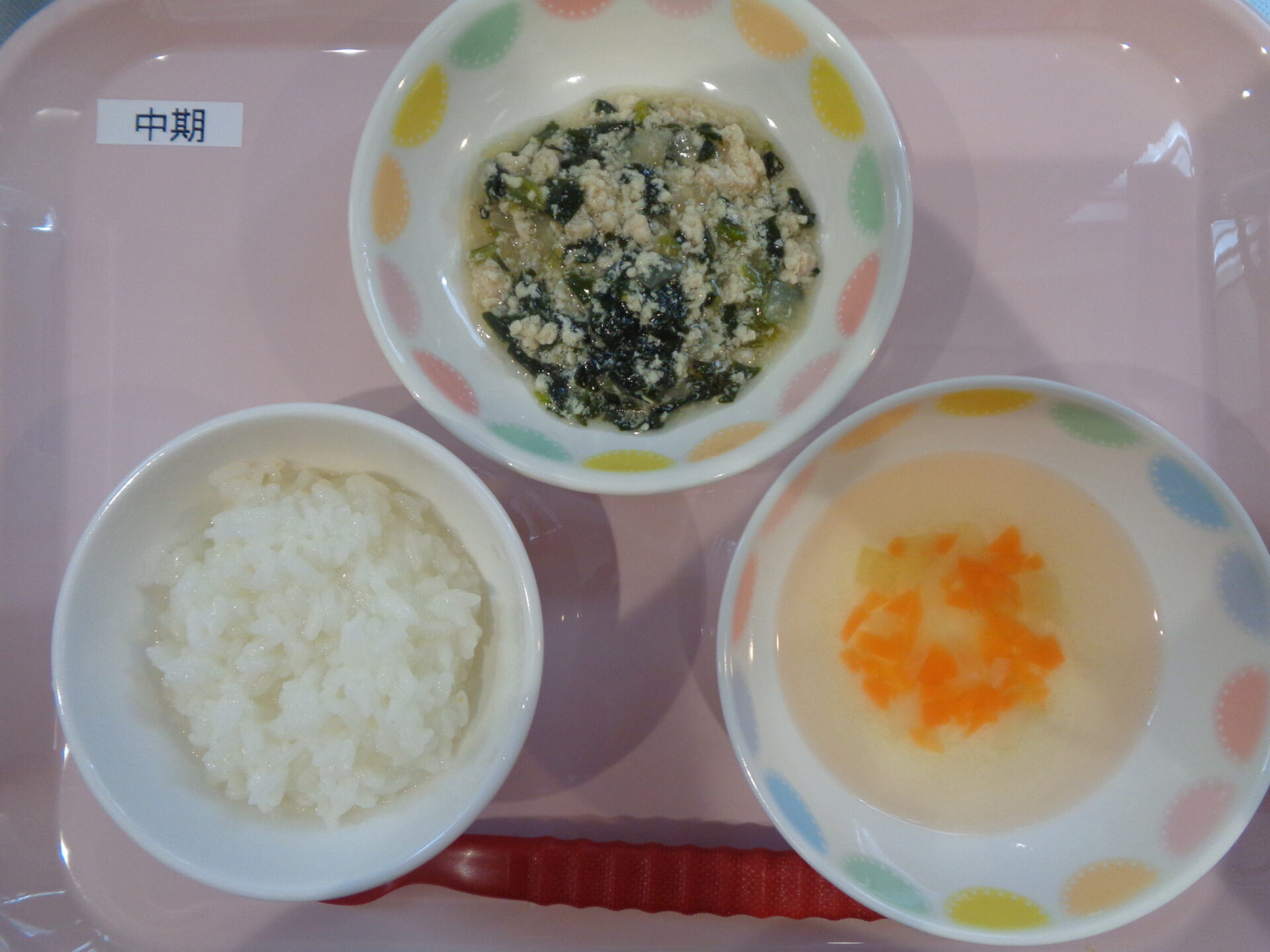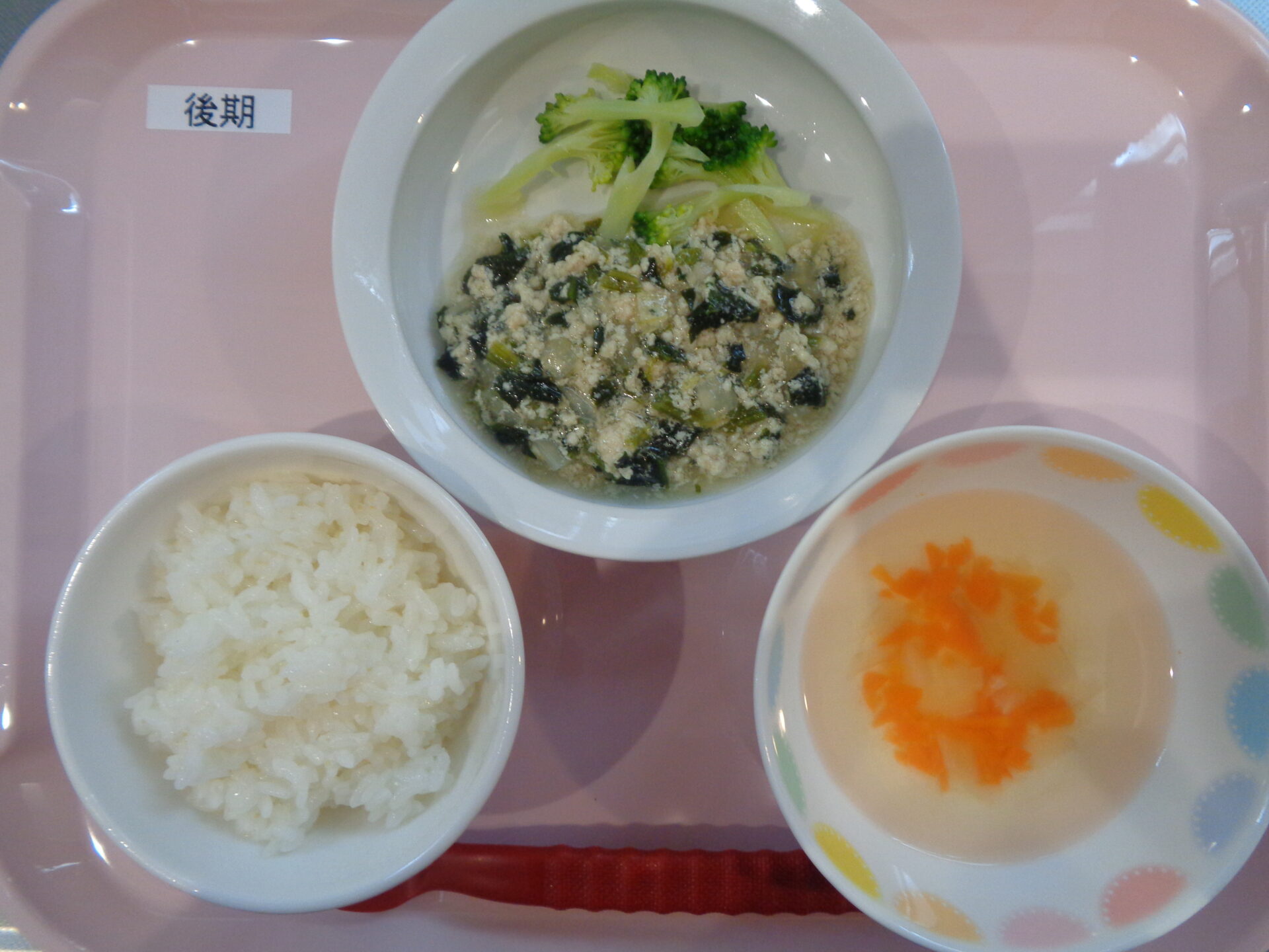 軟飯・鶏肉とほうれん草の煮物・ブロッコリースティック・玉ねぎとにんじんのスープ