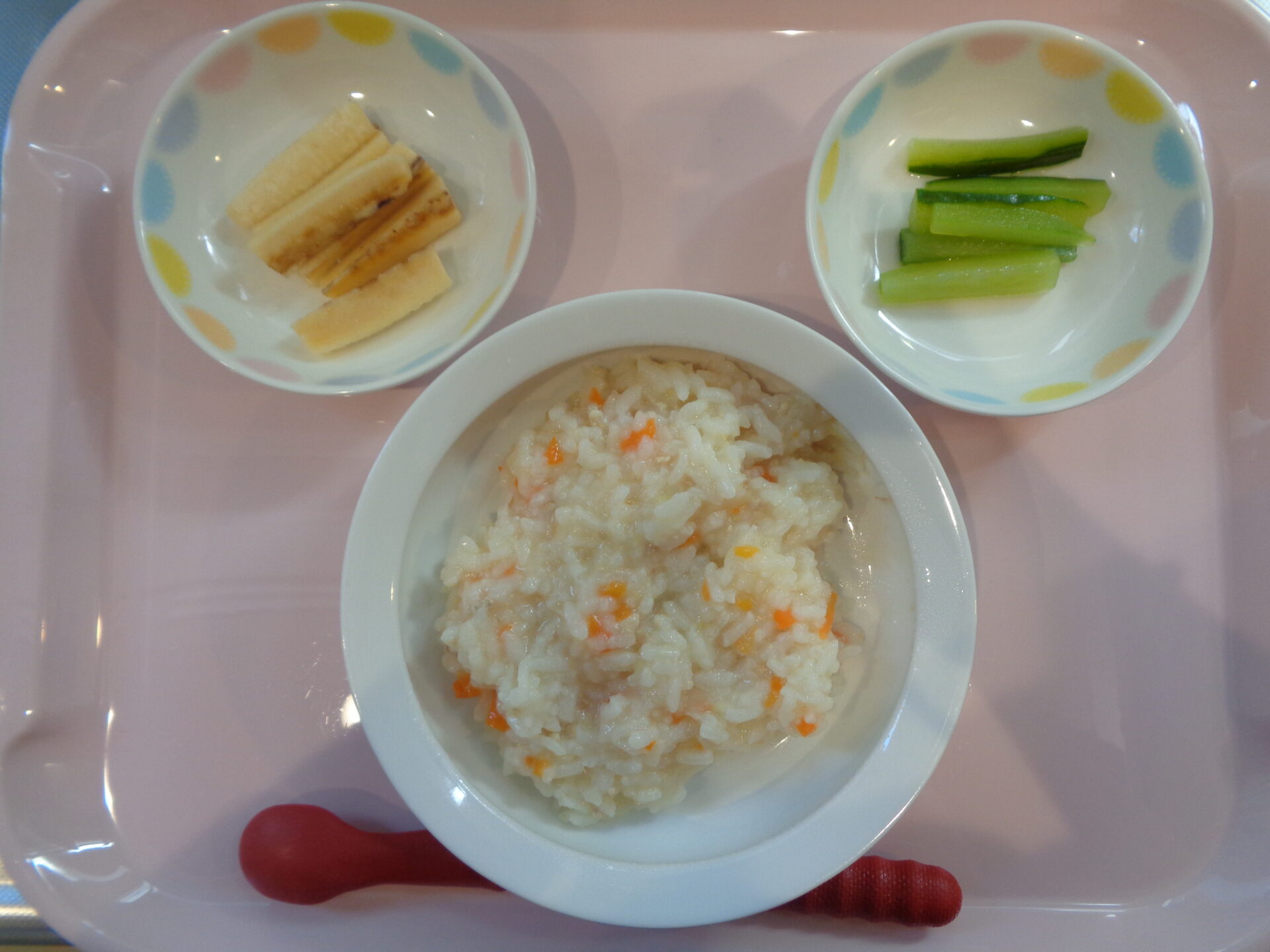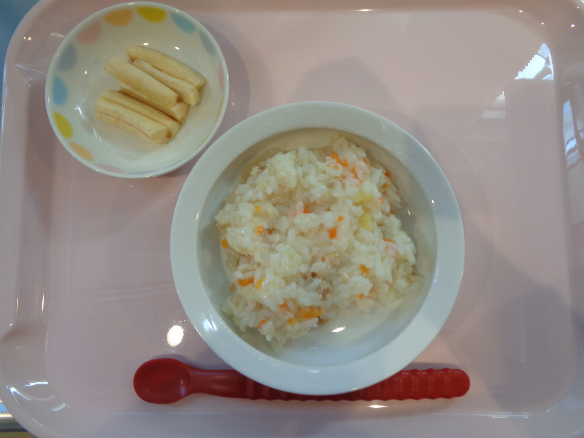 2024.11.14 給食写真 2024年11月14日 給食 【普通食】 チキンカレー・切り干し大根サラダ・バナナ 【離乳食・後期】 鶏肉と野菜のおじや・きゅうりスティック・バナナ 【離乳食・中期】 鶏肉と野菜のおじや・バナナ 一覧へ戻る