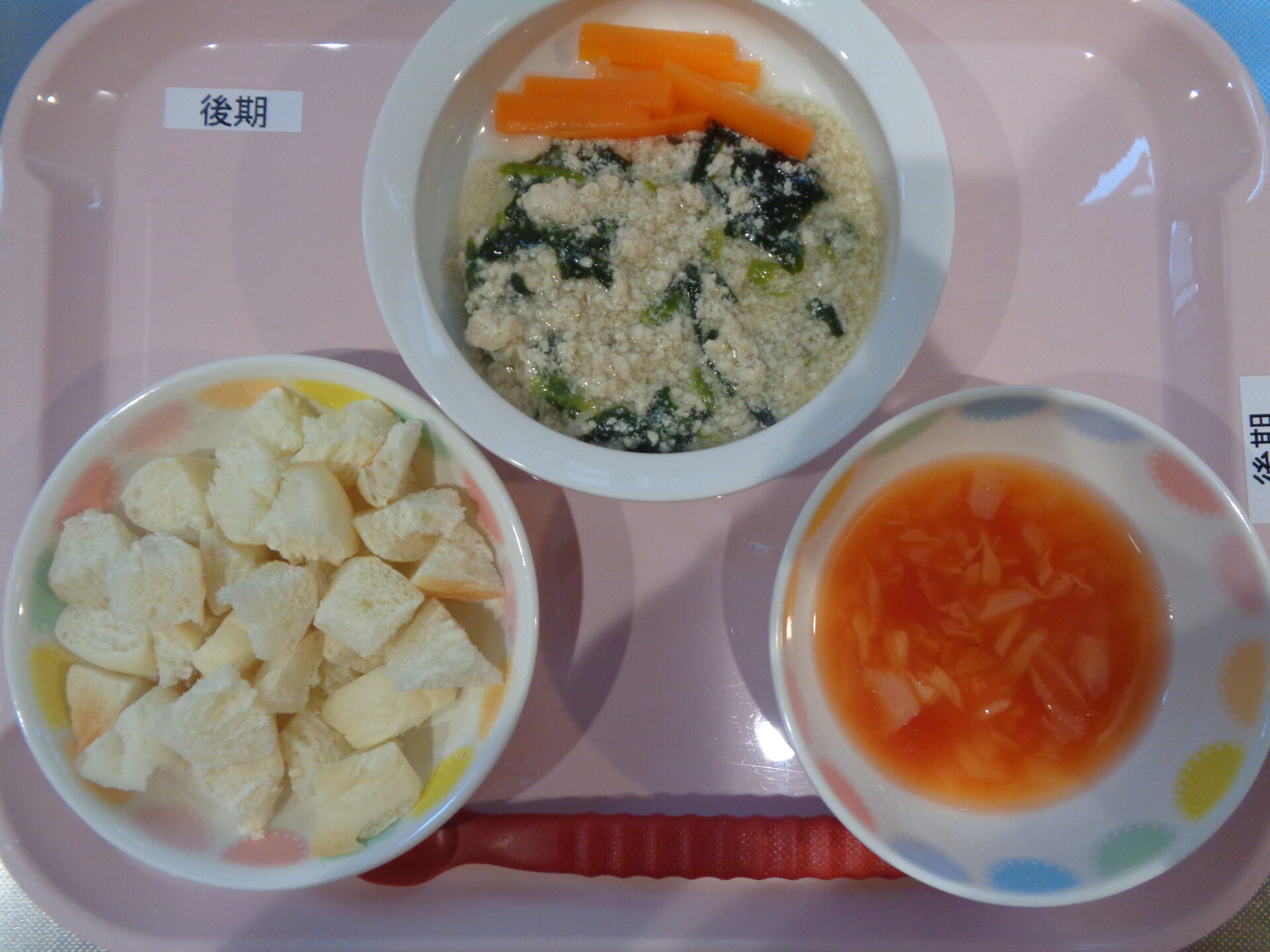 2024.11.15 給食写真 2024年11月15日 給食 【普通食】 ロールパン・鶏肉のチーズパン粉焼き・スパゲッティサラダ・トマトスープ 【離乳食・後期】 パン・鶏肉とほうれん草の煮物・にんじんスティック・トマトスープ 一覧へ戻る