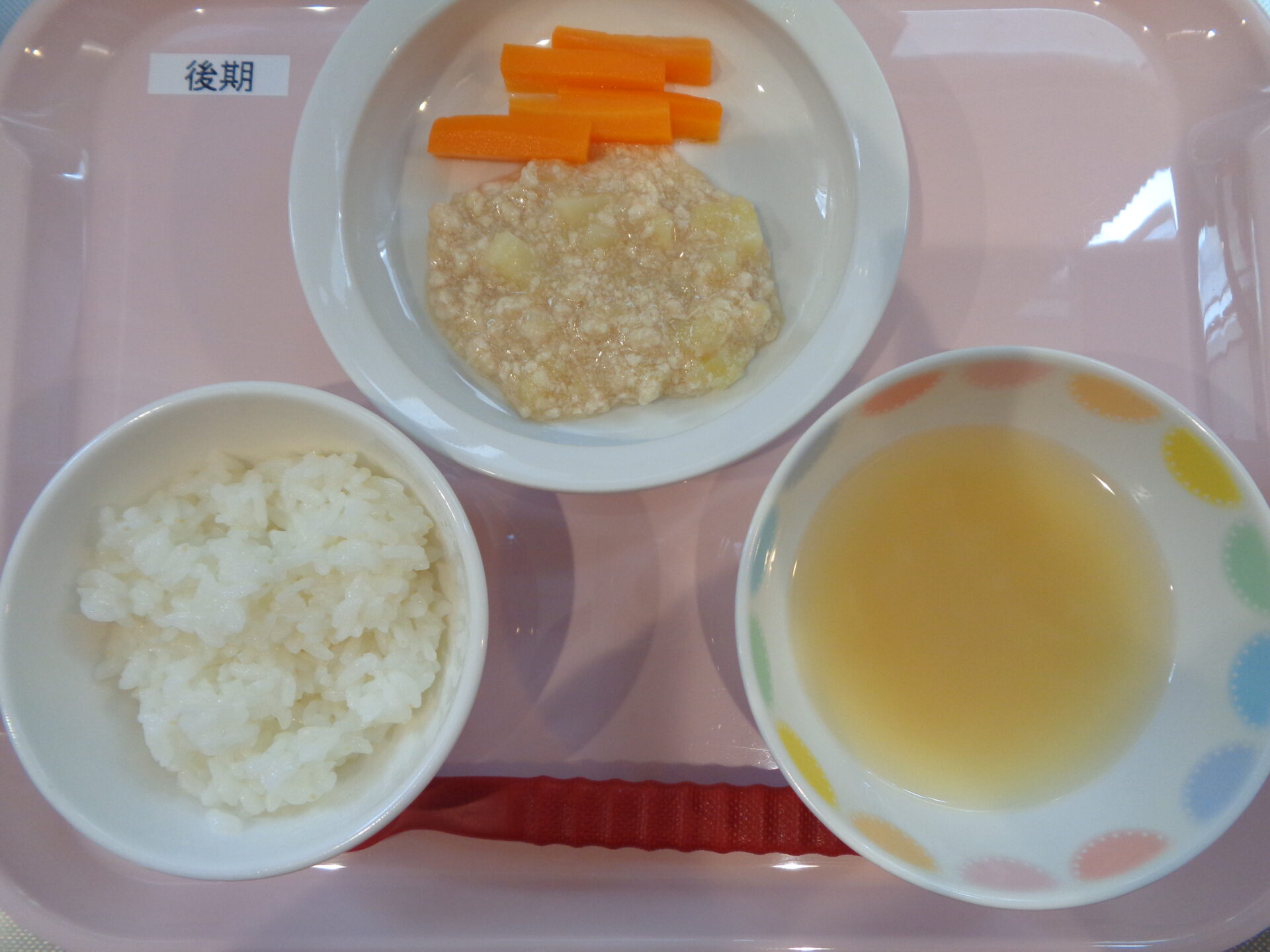 軟飯・鶏肉とじゃがいもの煮物・にんじんスティック・大根の味噌汁