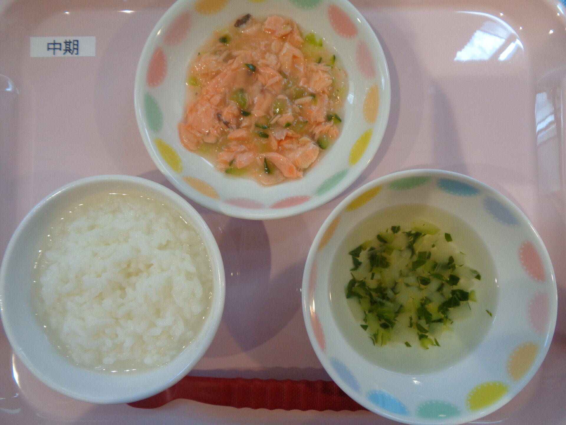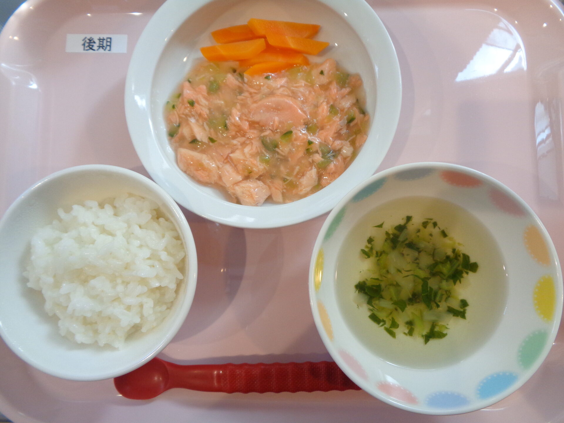 軟飯・鮭ときゅうりの煮物・にんじんスティック・小松菜のすまし汁